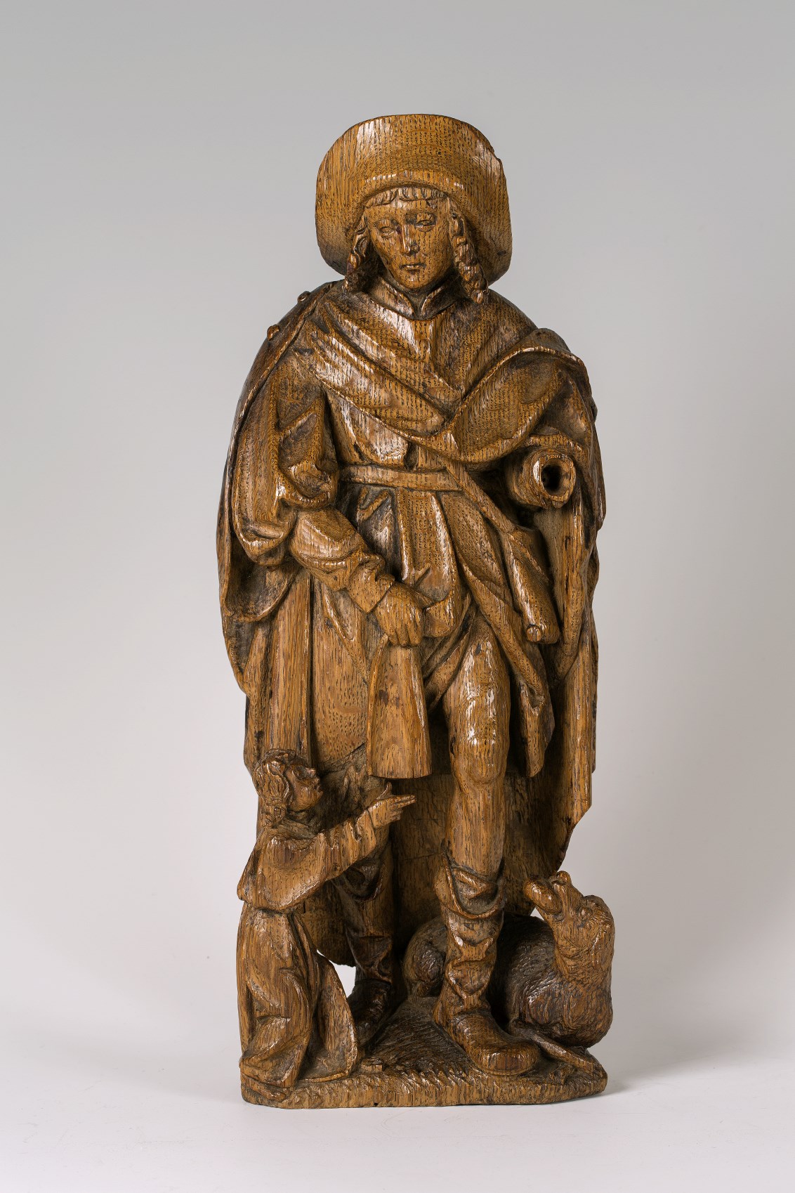 Rochus is staande voorgesteld met naar voren geplaatst linkerbeen. Hij toont de pestbuilen op zijn dijbeen door zijn tuniek met zijn rechterhand open te slaan. Aan zijn voeten links een hond met een stuk brood in zijn bek en rechts een engel wijzend op de pestbuilen op Rochus' linkerbeen. De figuren zijn geplaatst op een ...