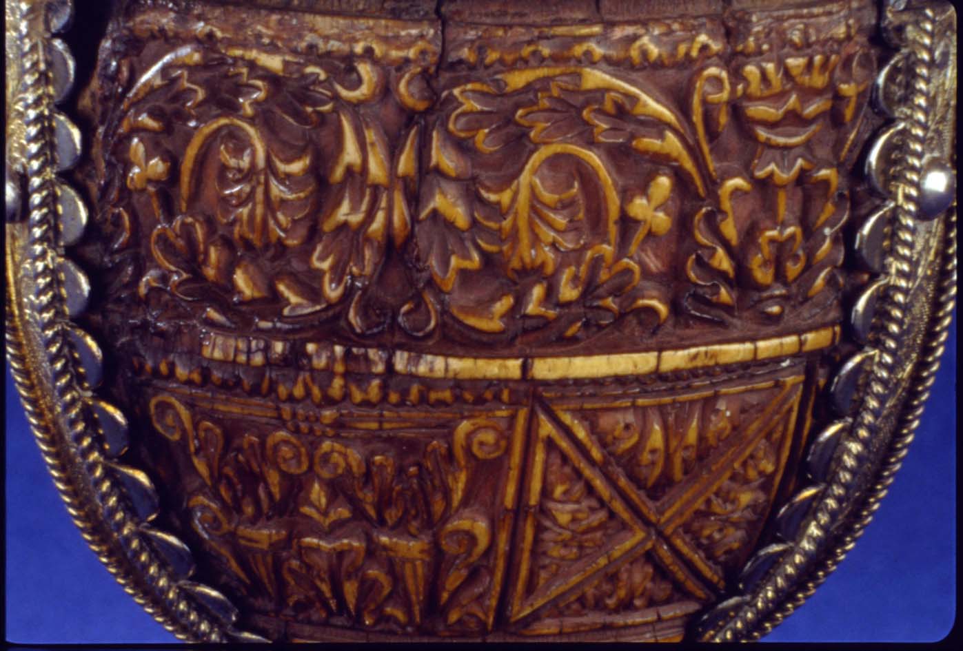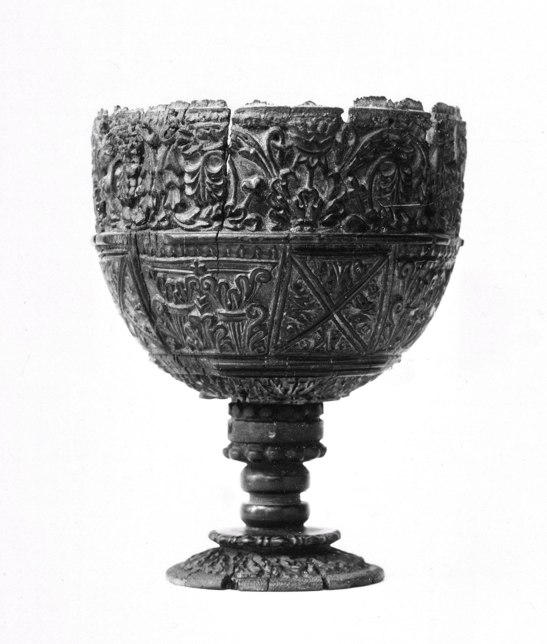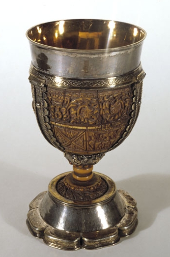 De ivoren kelk bestaat uit een naar verhouding grote cuppa, een korte geprofileerde stam en een kleine, ronde voet. De buitenzijde van de cuppa en de kelkvoet zijn rijkelijk overdekt met snijwerk van acanthusblad. De ivoren kelk is gevat in een montuur (met oud inventarisnummer ABM m1249) van verguld en verzilverd koper(?). De decoratie van ...