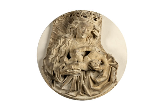 In een tondo, aan de onderzijde door een maansikkel, aan de bovenzijde door een rand gestyleerde wolken afgesloten, is Maria ten halve lijve in een stralenkrans voorgesteld. Zij draagt het naakte Christuskind op haar handen. Met haar linkerhand omvat zij zijn middel. Met haar rechterhand steunt zij zijn linkervoetje, terwijl zij tevens een slip van ...