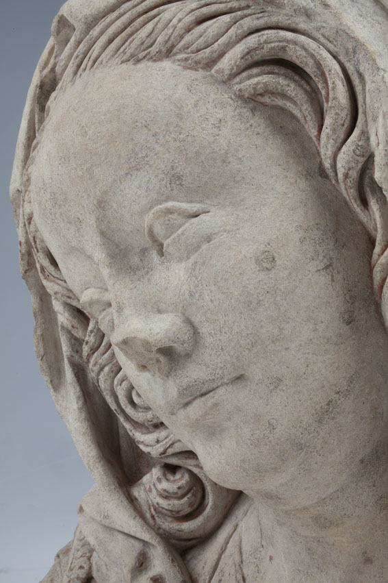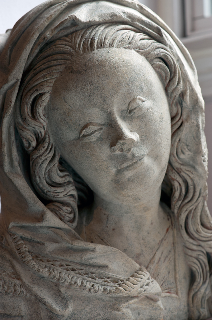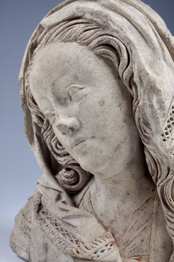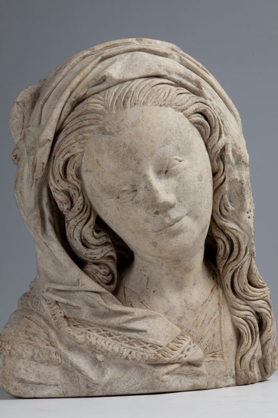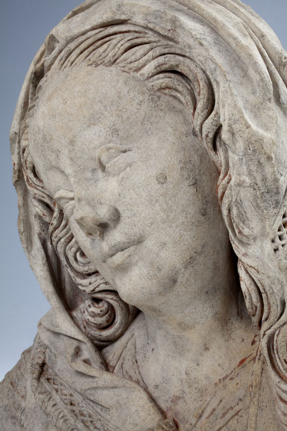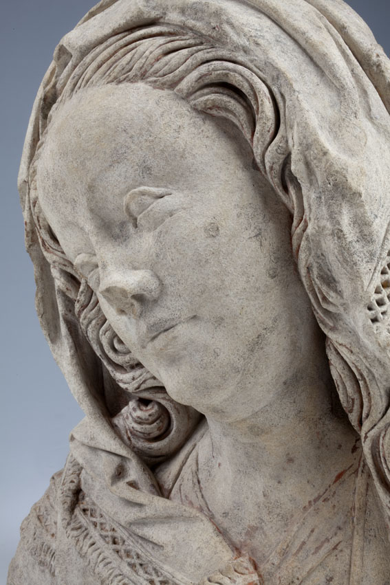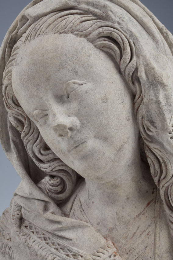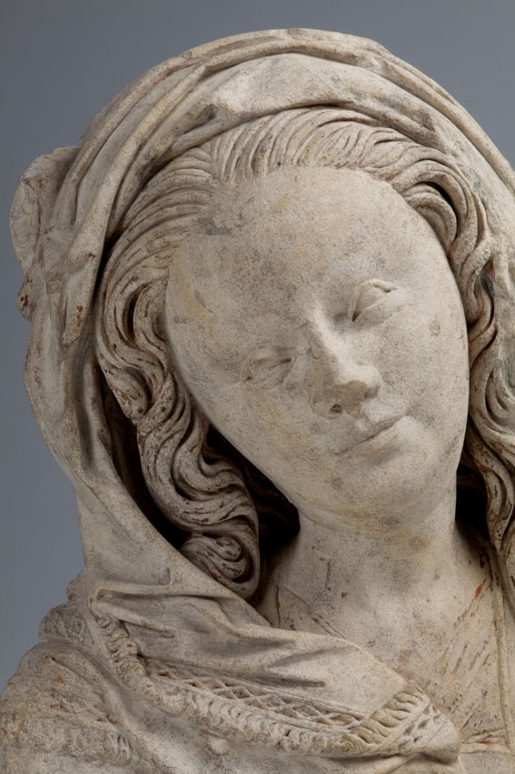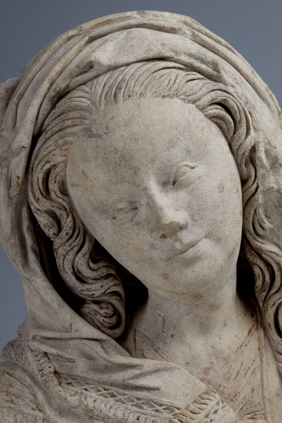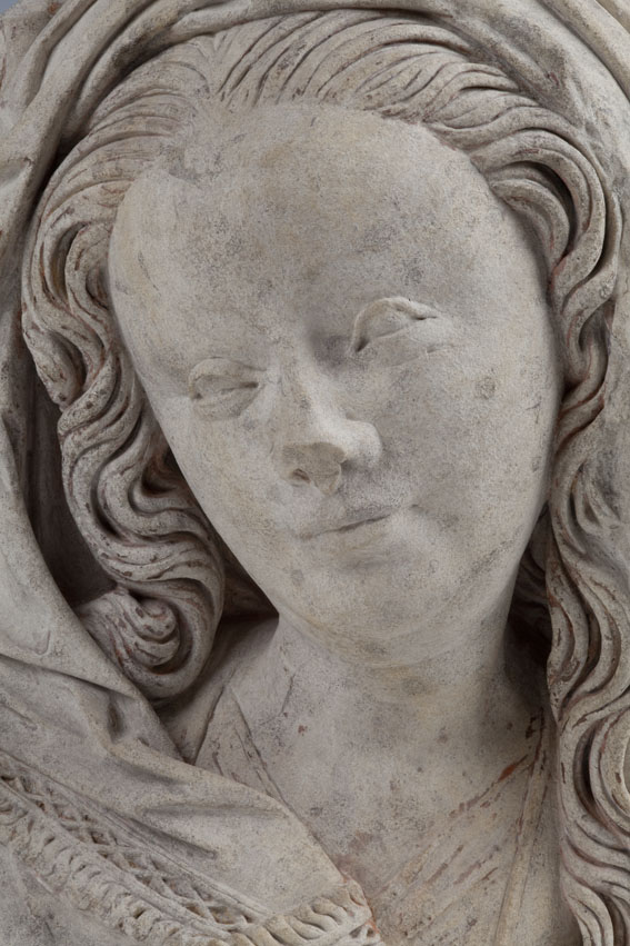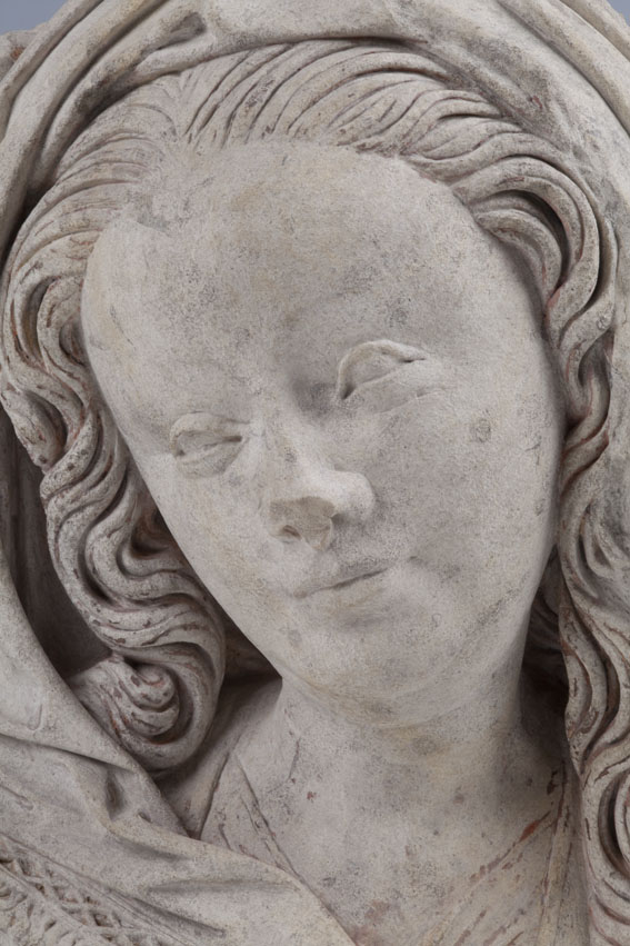 Maria heeft haar gelaat iets naar beneden gewend en heeft zich driekwart naar links gedraaid. Haar gezicht is eivormig en heeft een hoog, gebombeerd voorhoofd, een ronde kin, kleine halvemaanvormige ogen met wallen eronder, een wipneus en een vrij kleine, glimlachende mond. Maria draagt een bovenkleed met vierkante halsuitsnijding waarin een onderhemd zichtbaar is. Los ...