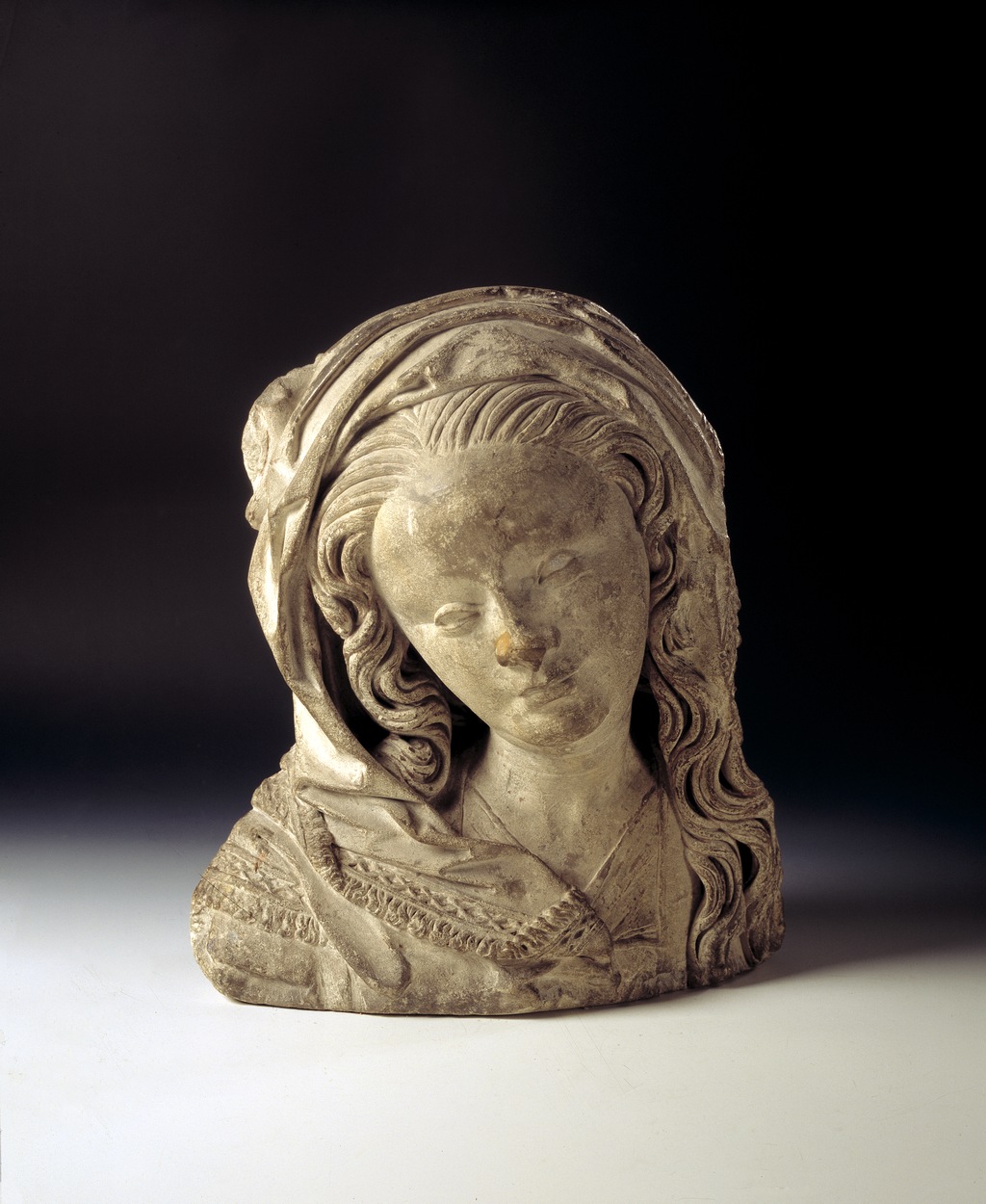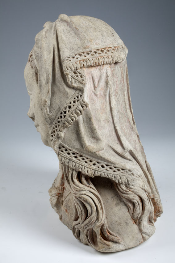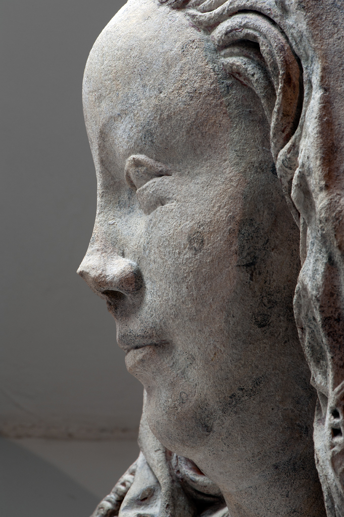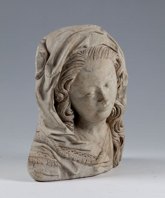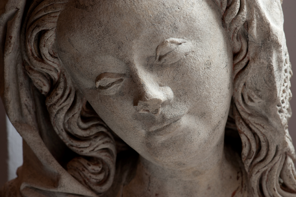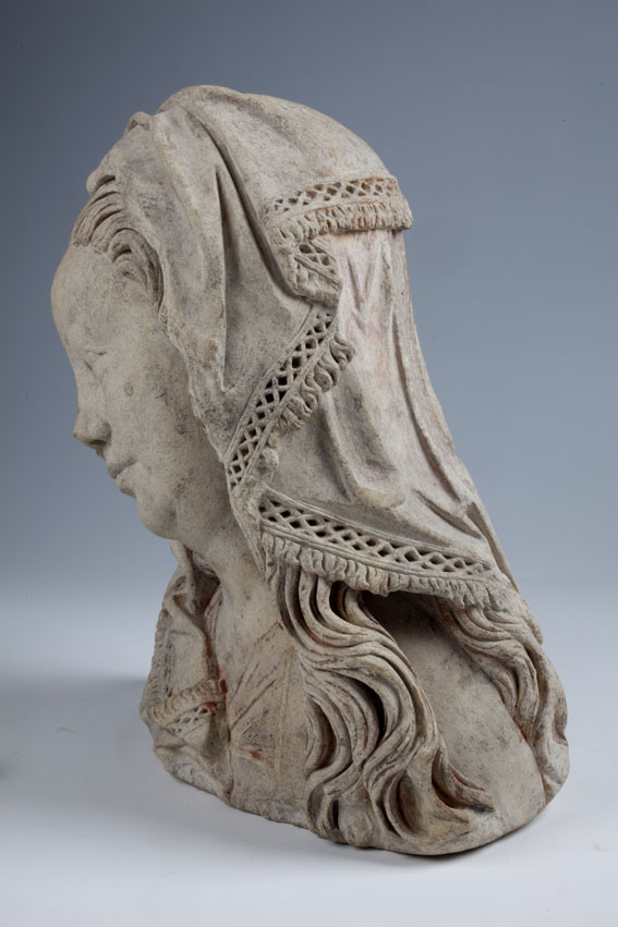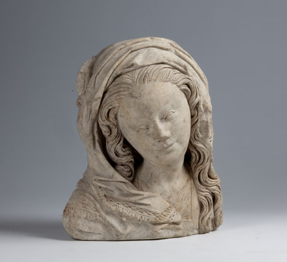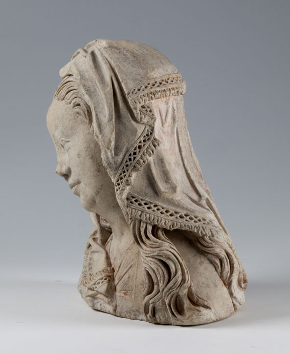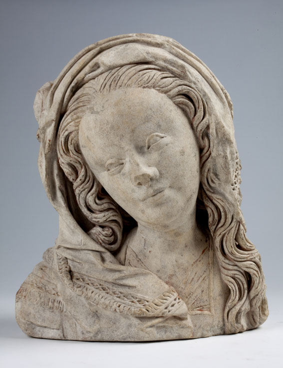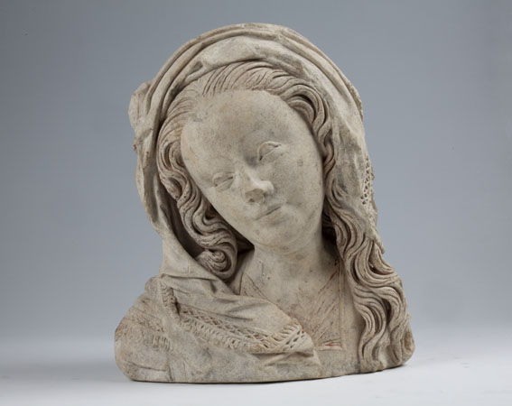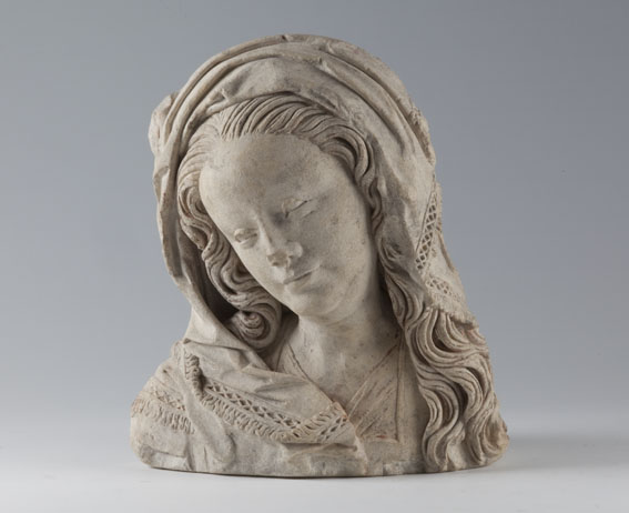 Maria heeft haar gelaat iets naar beneden gewend en heeft zich driekwart naar links gedraaid. Haar gezicht is eivormig en heeft een hoog, gebombeerd voorhoofd, een ronde kin, kleine halvemaanvormige ogen met wallen eronder, een wipneus en een vrij kleine, glimlachende mond. Maria draagt een bovenkleed met vierkante halsuitsnijding waarin een onderhemd zichtbaar is. Los ...