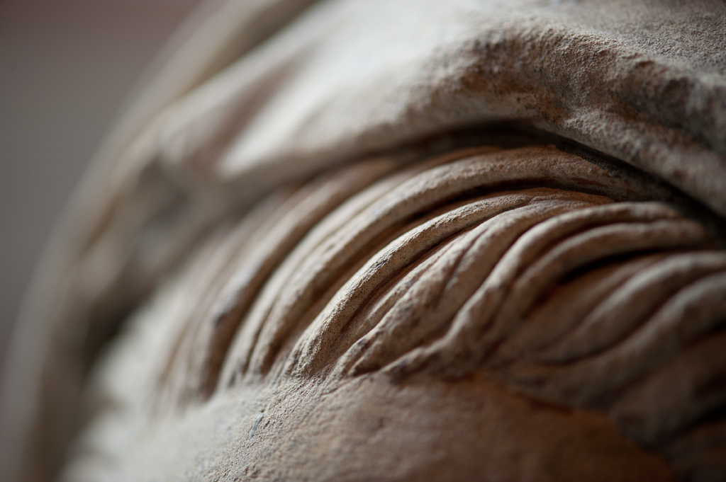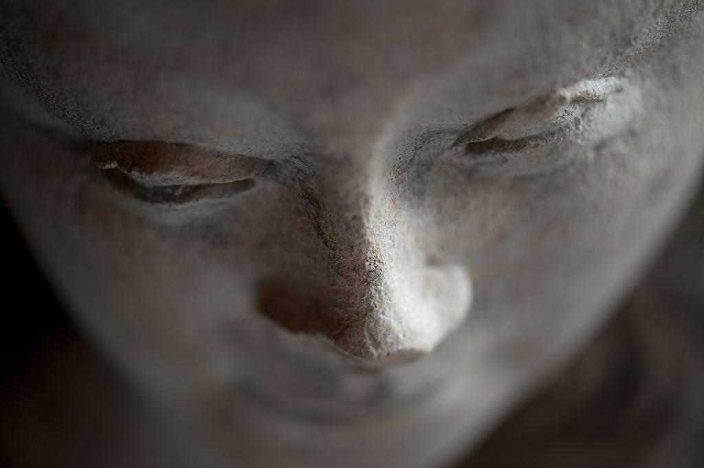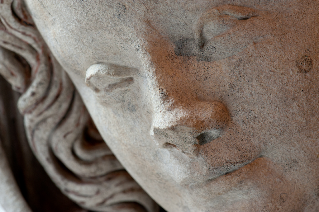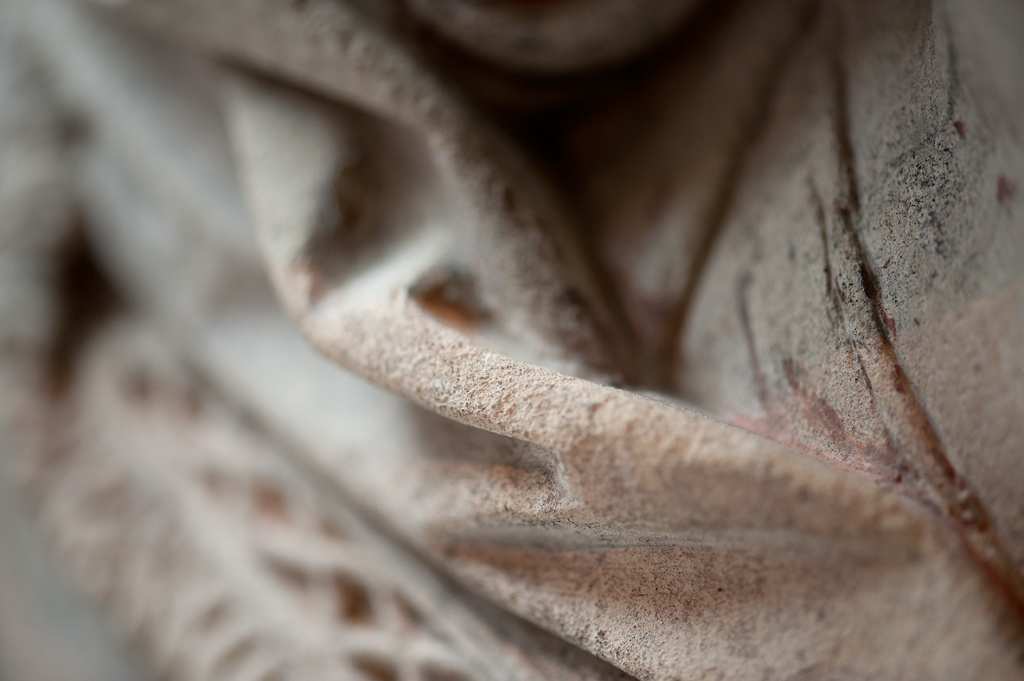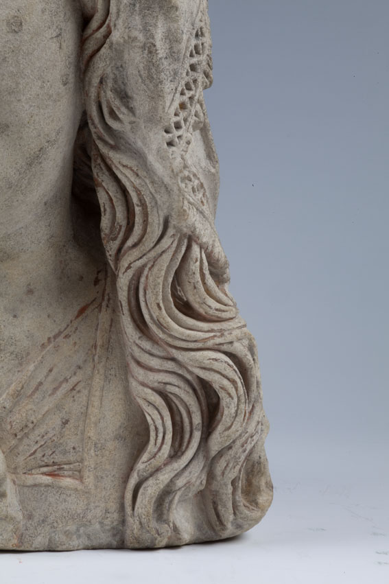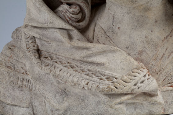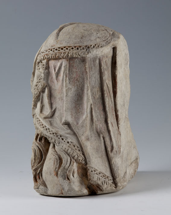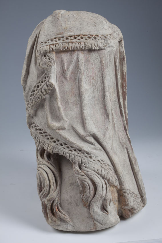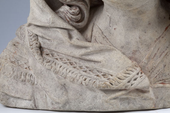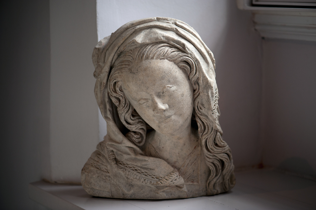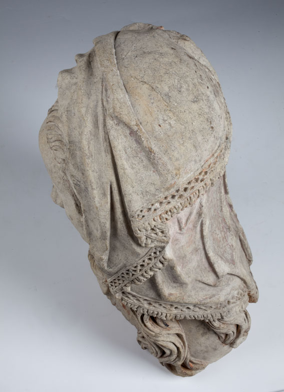 Maria heeft haar gelaat iets naar beneden gewend en heeft zich driekwart naar links gedraaid. Haar gezicht is eivormig en heeft een hoog, gebombeerd voorhoofd, een ronde kin, kleine halvemaanvormige ogen met wallen eronder, een wipneus en een vrij kleine, glimlachende mond. Maria draagt een bovenkleed met vierkante halsuitsnijding waarin een onderhemd zichtbaar is. Los ...
