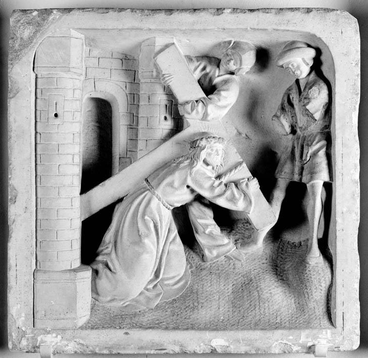 Christus is net buiten de stadspoort, die links is afgebeeld, op beide knieën neergevallen. Met zijn rechterhand houdt hij de dwarsbalk van het kruis vast. Zijn linkerhand steunt op de grond. Het kruis rust op zijn linkerschouder. Op de dwarsbalk zijn de ingegroefde stralen van zijn aureool te zien. Rechts staat een man die Christus ...