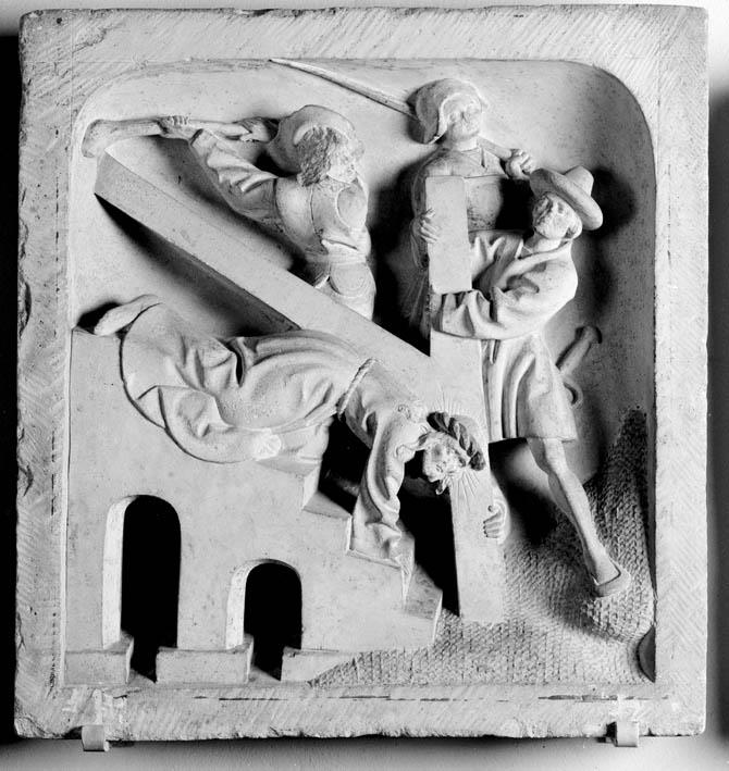 Vierde statie: Christus valt van de trap van het huis van Pilatus