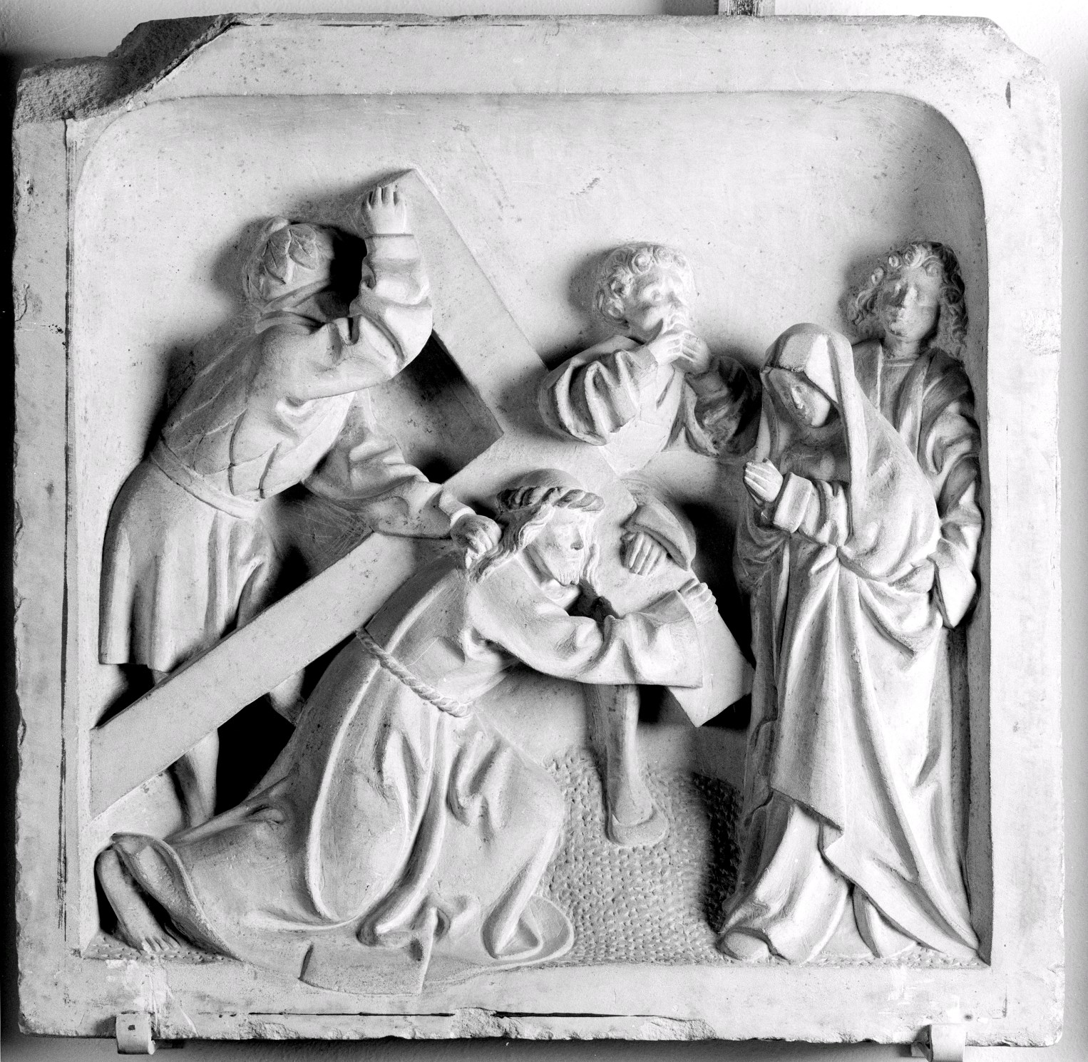 Christus draagt het kruis naar rechts, waar Maria en Johannes staan. Hij zakt diep door zijn knieën en omvat de dwarsbalk met beide handen. Achter het kruis staan twee mannen. De achterste trekt met zijn linkerhand aan Christus' haar en drukt met zijn rechter het kruis naar beneden. De voorste leunt op het kruis en ...