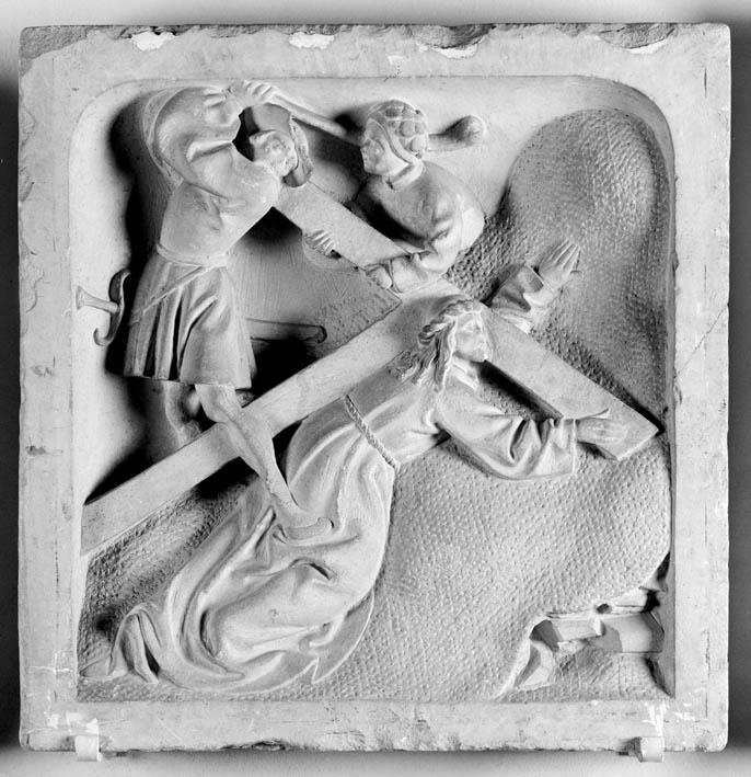 Christus is op het onderste deel van de Calvarieberg onder de last van het kruis neergevallen. Hij ligt, en profil naar rechts, uitgestrekt tegen de berg die naar rechts toe hoog oprijst en meer dan de helft van het reliëf inneemt. Het kruis ligt over zijn linkerschouder. Zijn rechterhand rust op de dwarsbalk van het ...