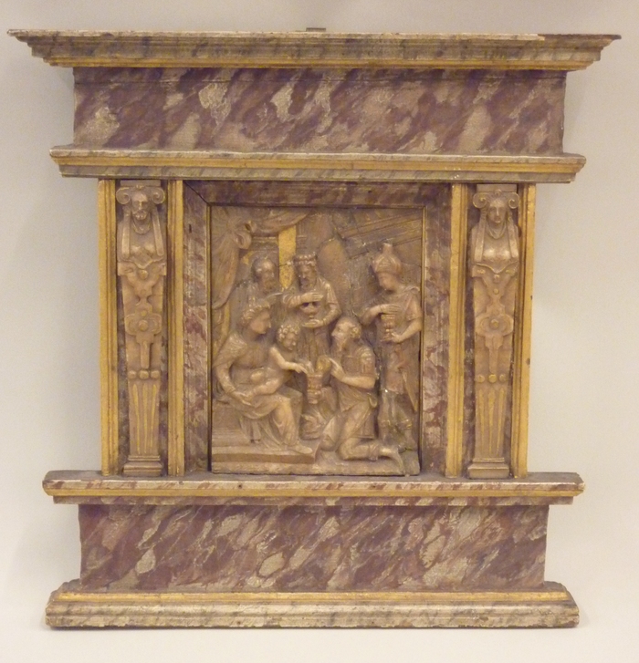 In een gemarmerde eikenhouten lijst in de vorm van een aediculum met twee hermen van albast is een rechthoekig albasten reliëf gevat met de voorstelling van de Aanbidding der Koningen. De lijst heeft als bekroning een gemarmerd eikenhouten fronton met een albasten medaillon in een cartouche van verguld stuc, door twee putti- eveneens van verguld ...