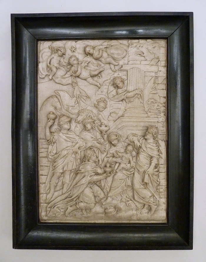 Aanbidding der koningen, zij naderen van links, links boven vliegende engelen, in zwarte lijst