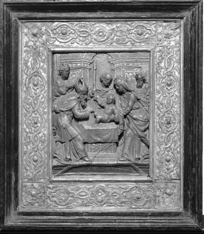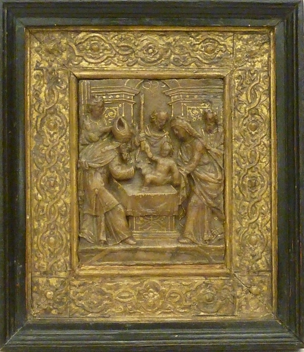 Besnijdenis, Maria, Christuskind, priester, Jozef, twee mannen, in lijst met verguld stucwerk