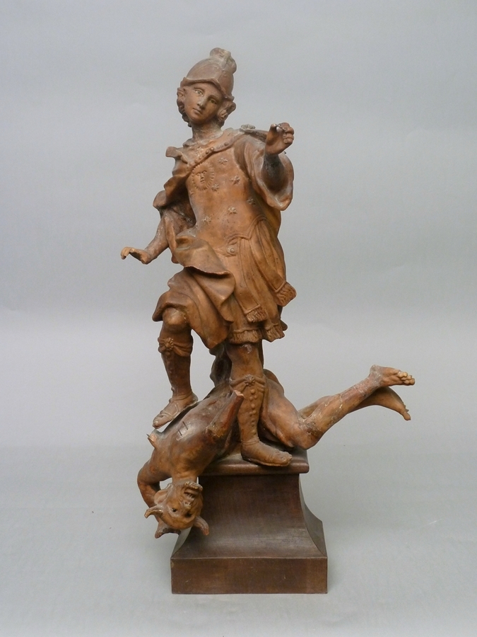Aartsengel Michaël vertrapt onder rechtervoet de duivel, op sokkel