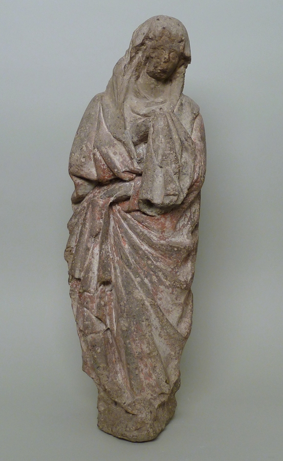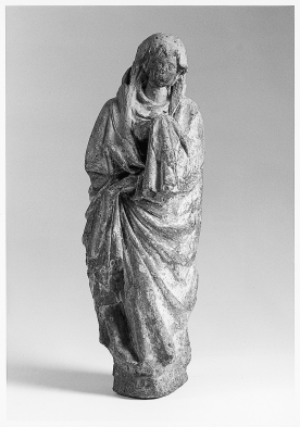 Maria is staande voorgesteld. Haar rechterbeen (?) is iets naar voren geschoven. Haar hoofd neigt enigszins naar rechts. Met haar linkerhand houdt zij haar mantel op, terwijl ze met haar rechterhand een doek naar haar ogen brengt. Maria's gestalte is vrijwel geheel verhuld door haar wijde mantel, die ze naar links rond haar lichaam heeft ...