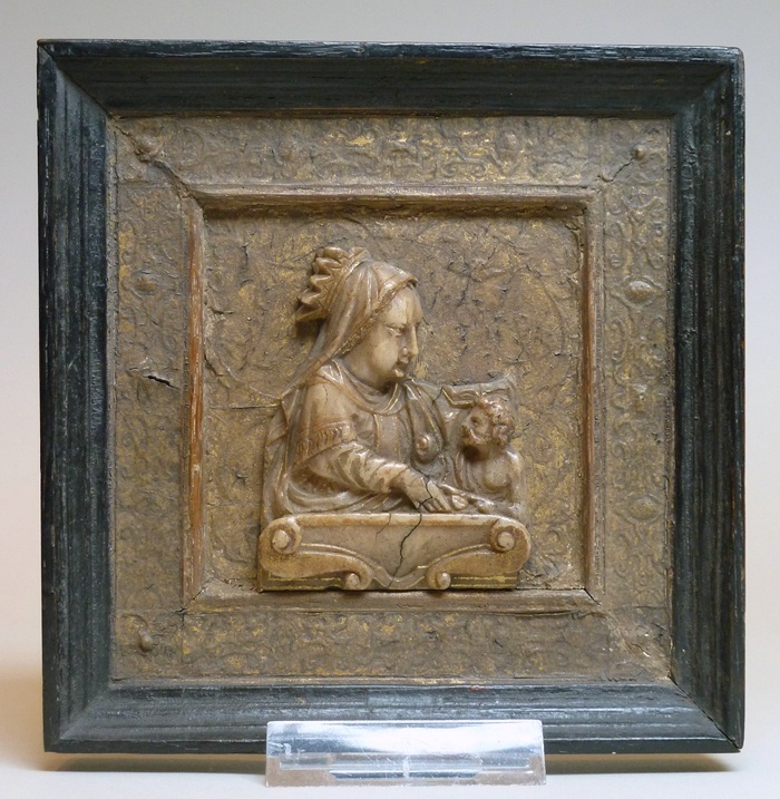 Elisabeth is ten halve lijve, en profil voorgesteld. Ze heeft haar hoofd naar rechts gewend. Op haar linkerhand draagt ze een opengeslagen boek. Met haar rechterhand geeft ze een broodje aan de veel kleinere, voor haar afgebeelde bedelaar. De bedelaar pakt dit aan met zijn linkerhand, terwijl hij met zijn opgeheven rechterhand er al een ...