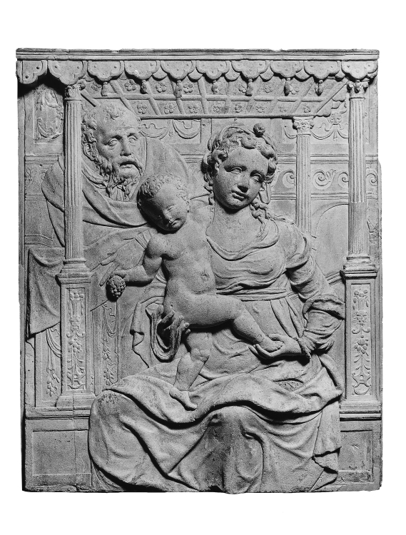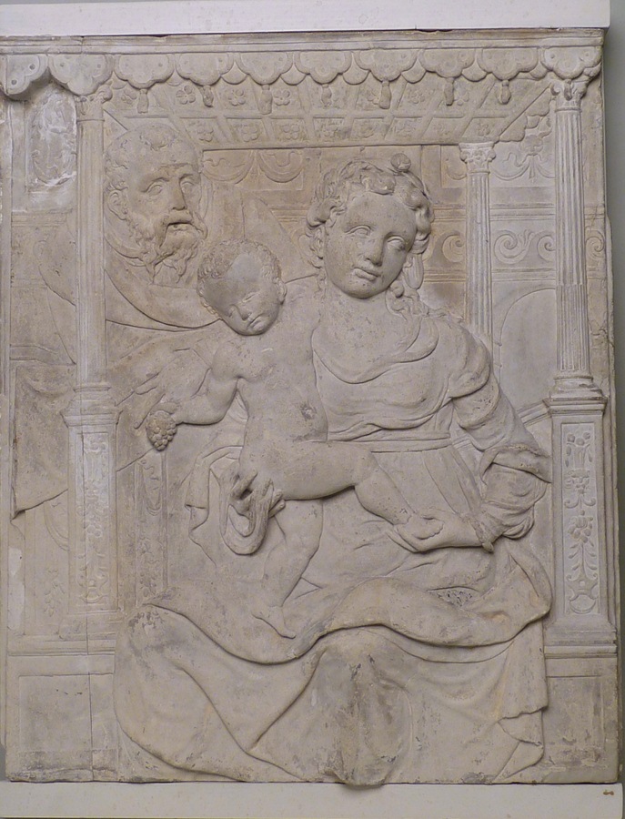 Onder een baldakijn of troonhemel is Maria voorgesteld met het Christuskind op schoot. Met haar door een doekje bedekte rechterhand steunt zij het Christuskind, dat op haar schoot staat. Met haar linkerhand omklemt zij zijn rechtervoetje. De kleine Christus heeft zijn linkerarmpje om Maria's hals geslagen. In zijn rechterhand houdt hij een druiventros. Schuin achter ...