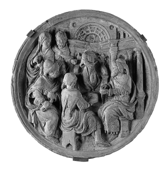 In het midden van de tempel, die aangeduid is door rijke renaissance architectuur, zit Christus in een op een verhoging geplaatste zetel voor een met cassetten versierde nis. Hij houdt zijn rechterarm voor zijn lichaam. Voor hem zitten in een halfronde opstelling drie schriftgeleerden op lage bankjes, naar hem te luisteren. De schriftgeleerde geheel links ...