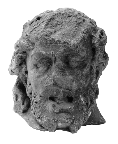 Christus is voorgesteld met half gesloten ogen en half geopende mond, waarin de tong zichtbaar is. De kop is omgeven door halflang haar, dat neergolft tot in de hals en nek. De baard bestaat uit korte, golvende lokken. Rond het hoofd de doornenkroon, waarin de gaten voor ijzeren doornen. Polychromie: Kleine restjes zwart met witte ...