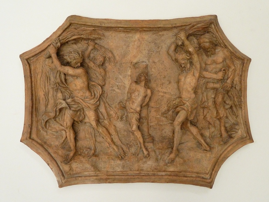 Achthoekig reliëf met geseling van St. Trifoul door vier personen