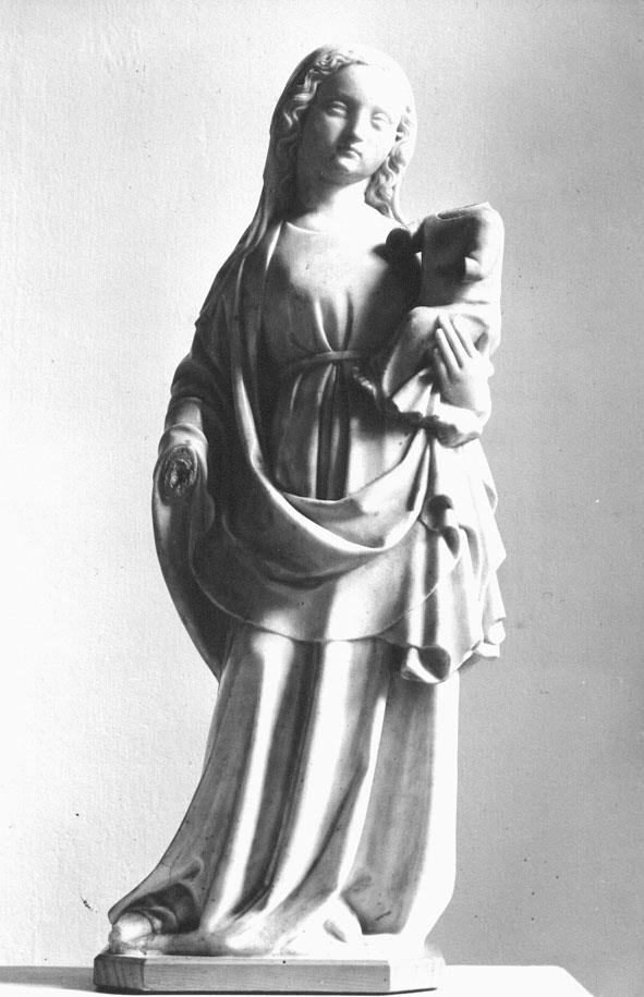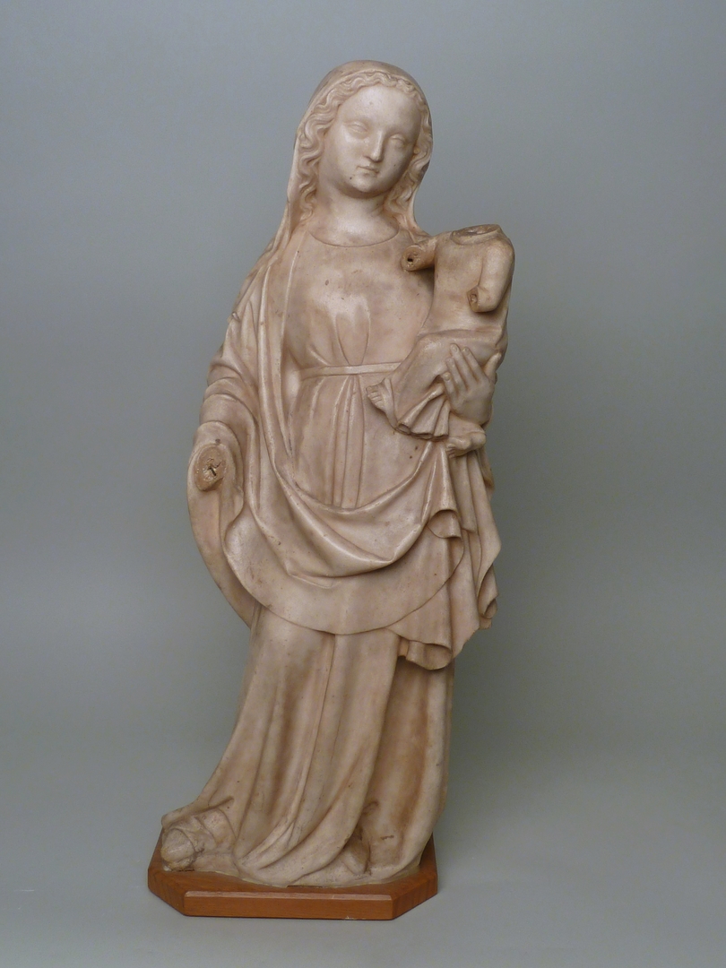 Maria is staande voorgesteld, rustend op haar linkerbeen. Op haar linkerarm draagt zij het Christuskind, dat zijn linkerbeentje heeft opgetrokken. Maria draagt een lang, gegord gewaad en een mantel, die over haar rechterarm is gedrapeerd en die zij ophoudt onder haar linkerarm. Over het golvende haar draagt zij een sluier. Aan haar voeten heeft zij ...