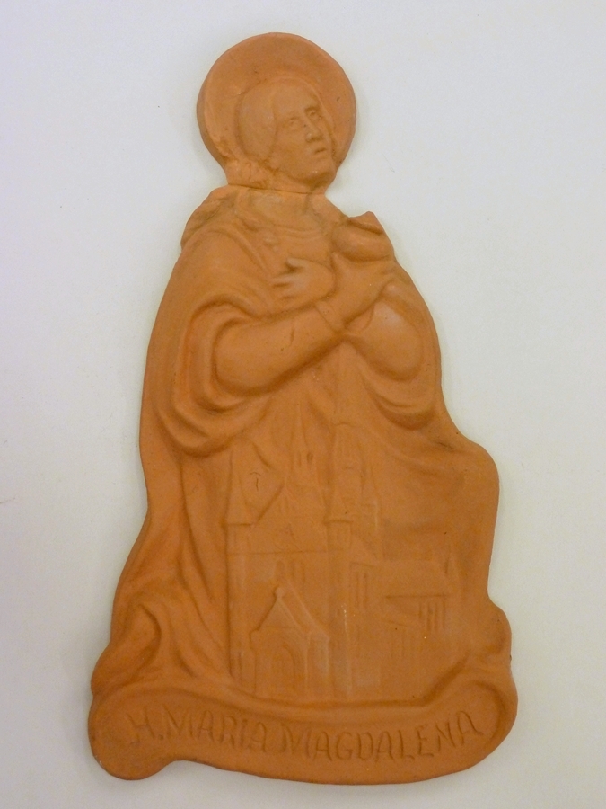 Patronale Maria Magdalena, op voorgrond kerk waaronder banderol met tekst