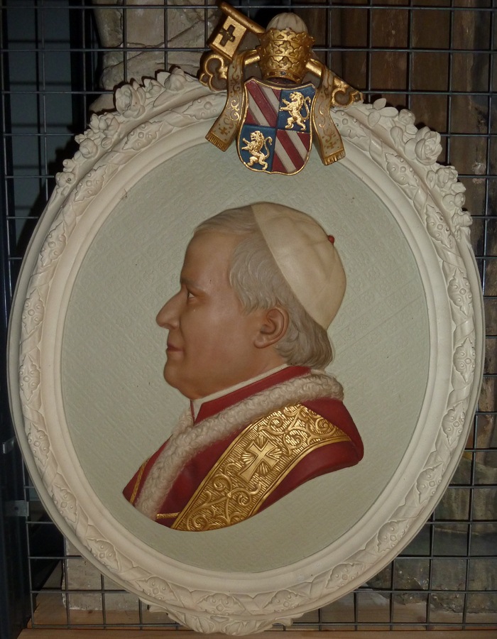 Gipsreliëf van paus Pius IX, met pauselijk wapen afkomstig uit paus Adriaanschool