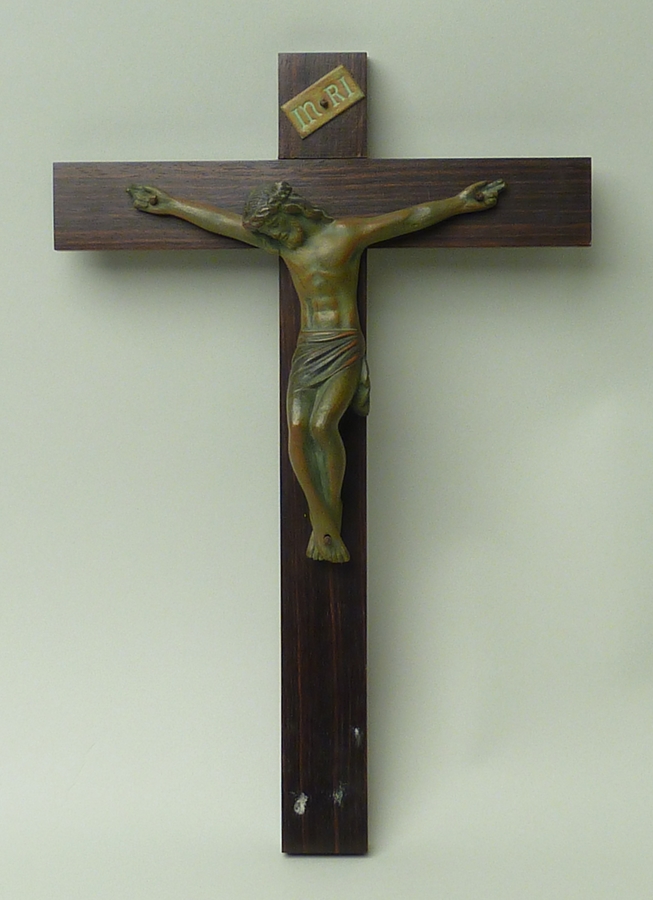 Palissanderhouten kruisje met groen bronzen corpus en INRI-bordje