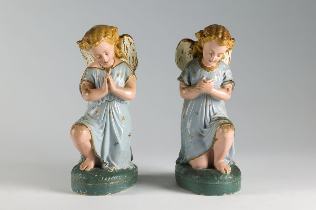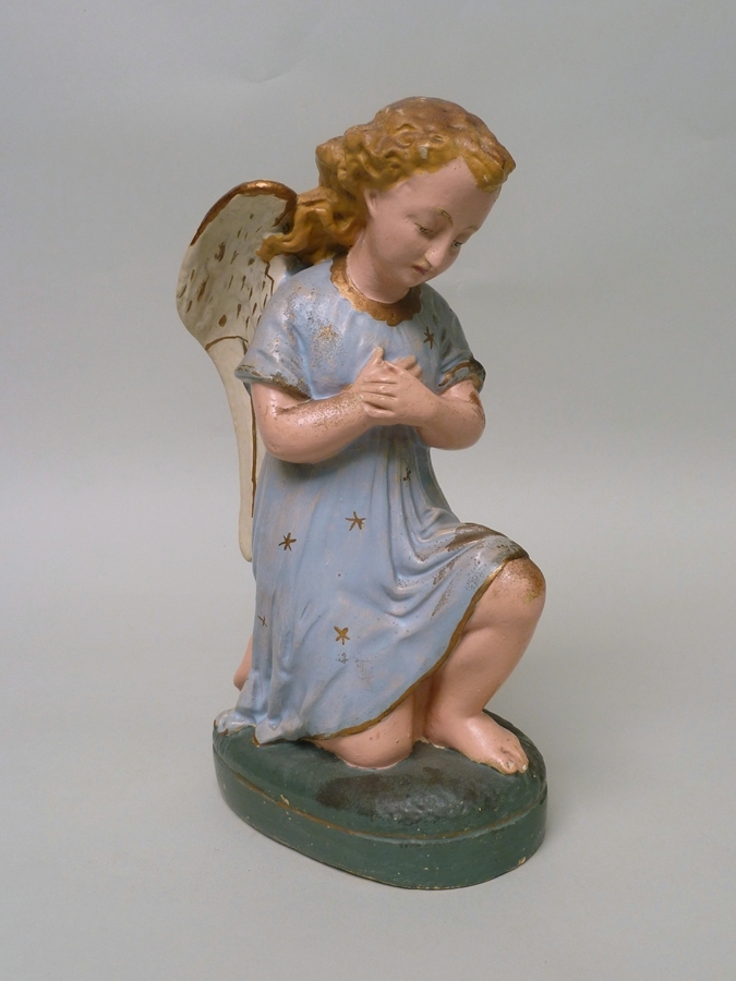 Knielende engel, tweede van twee in blauw tuniek met gouden sterren, met handen op hart