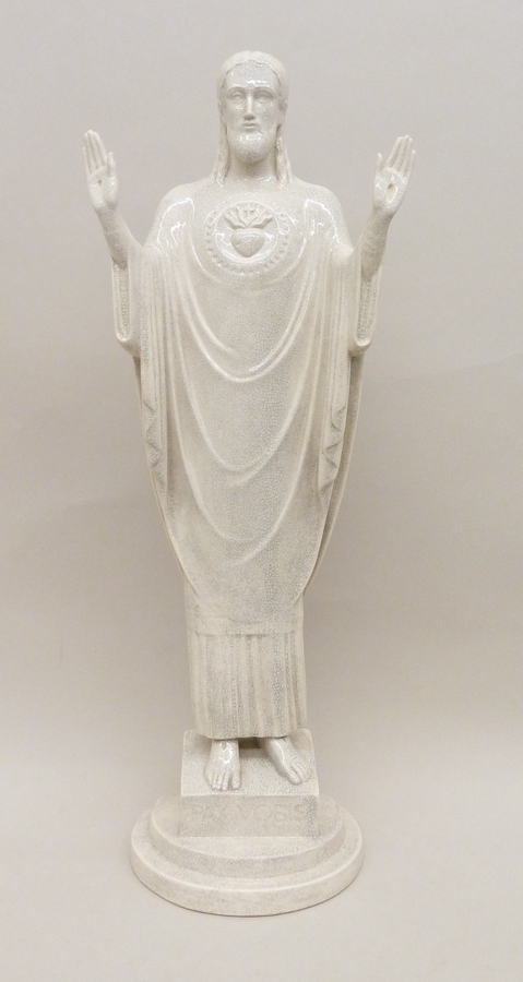 Staande H. Hart Christus met uitgespreide armen, op rechthoekig piedestal op twee halfronde treden