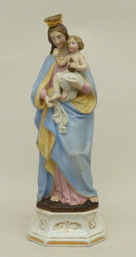 Gekroonde Maria in blauwe mantel met Christuskind met wereldbol op linkerarm