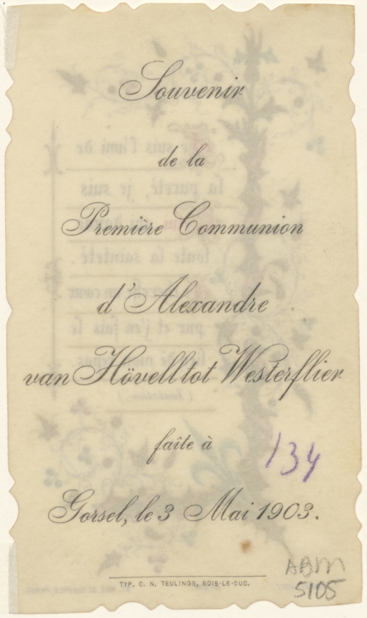 Communieprent met "Je suis lámi de la pureté, ...", kz. H. Communie Alexander van Hövell tot Westerflier;Gorssel;1903