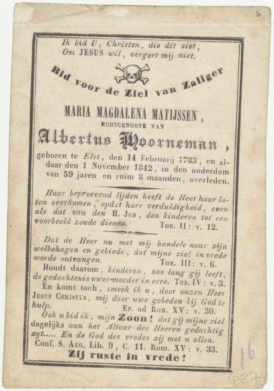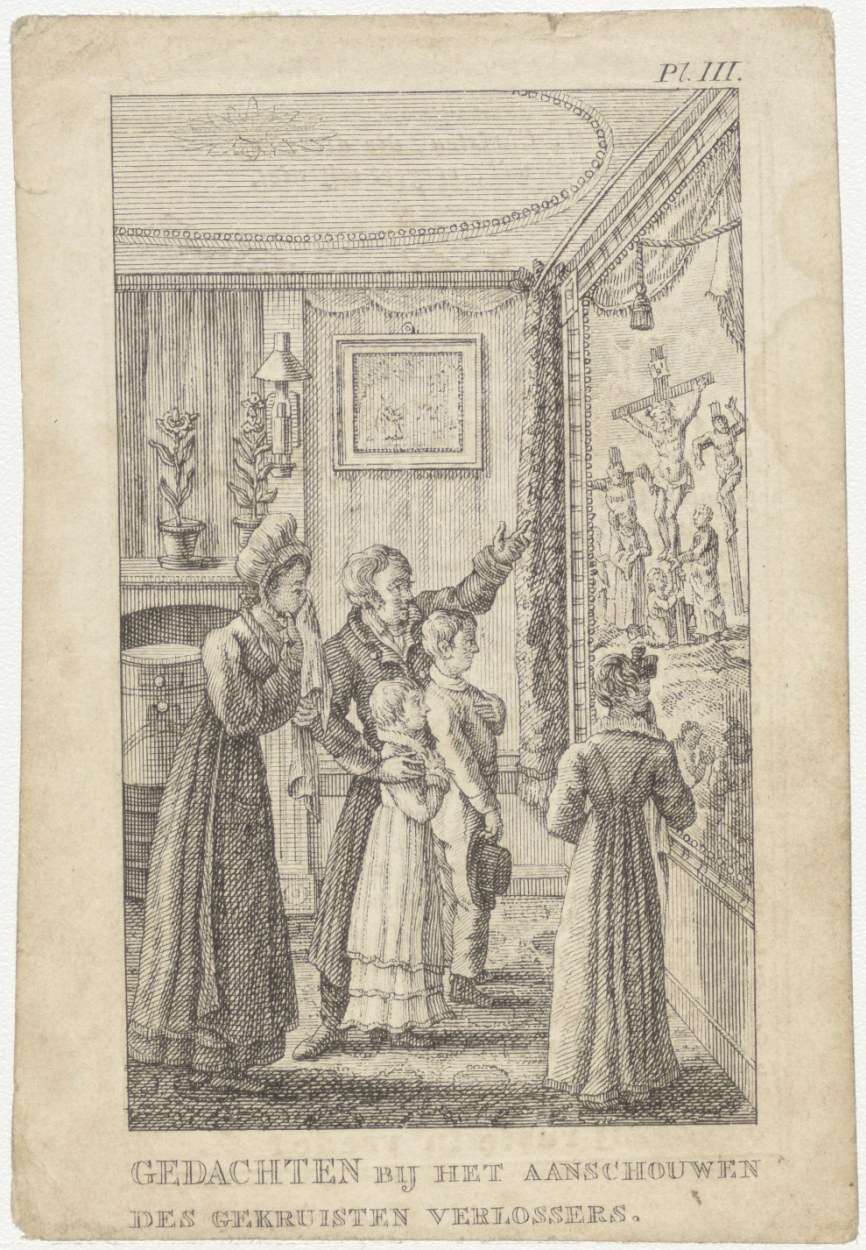 Gezin beschouwt een schilderij met voorstelling van de kruisiging, kz. Bid voor ziel Matijssen (+1783);Elst
