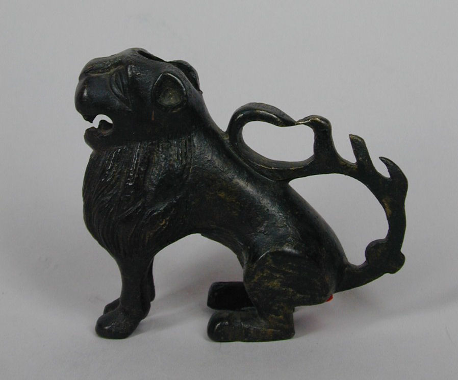 Leeuwtje, zittend met geopende bek, onderin de buik gat voor toevoerbuis water, fonteinfragment