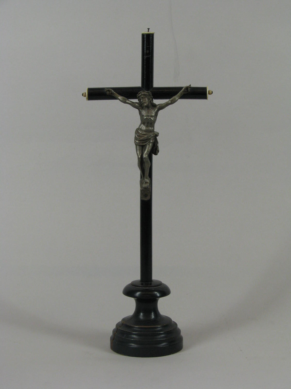 Crucifix, metalen corpus, op zwart geschilderd houten kruis met benen knopjes aan uiteinden