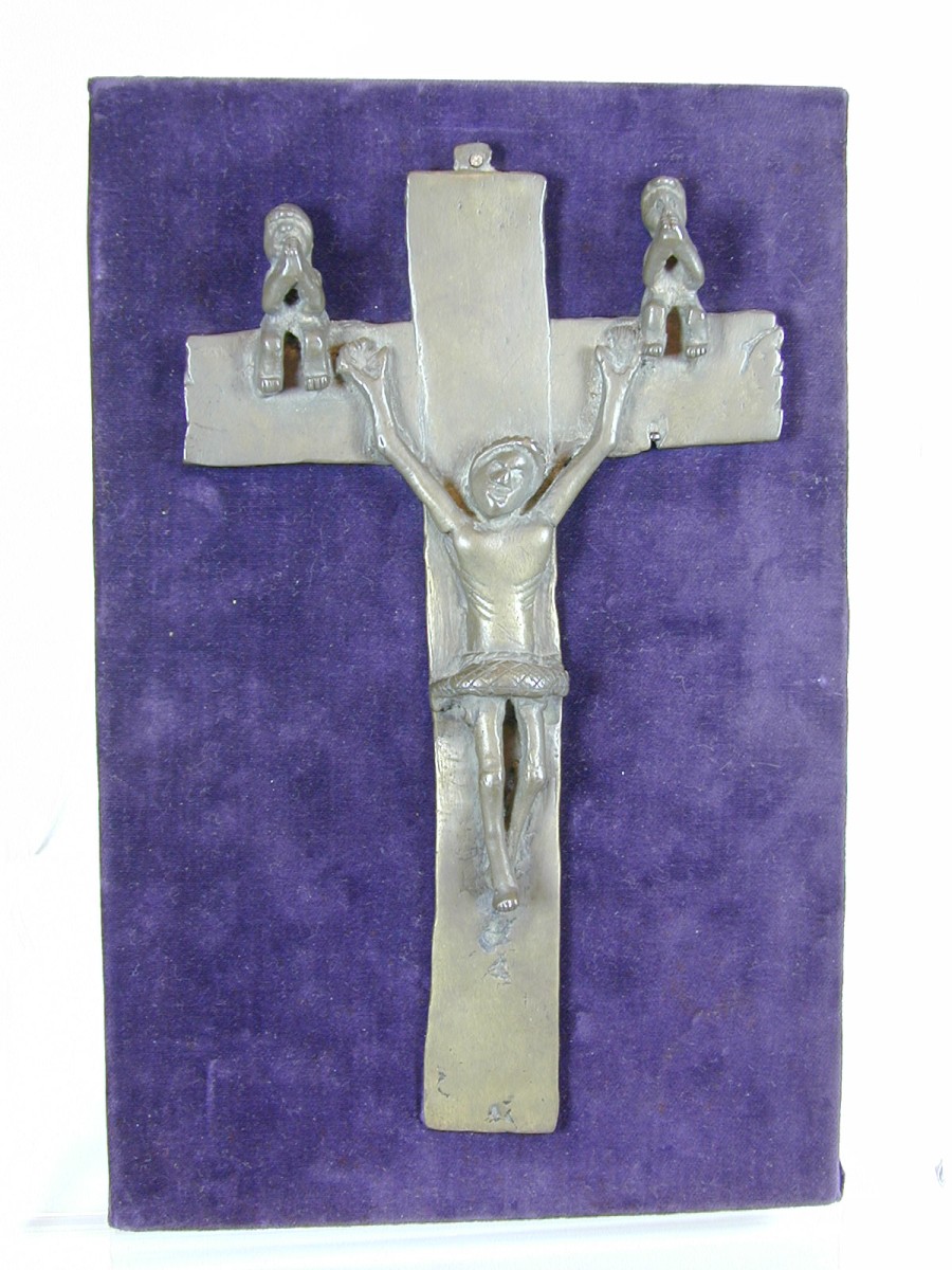 Crucifix met Christusfiguur met Afrikaans uiterlijk, op plankje met paars fluweel