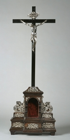 Kruisbeeld met bergplaats, zilveren corpus, zwart geschilderd hout