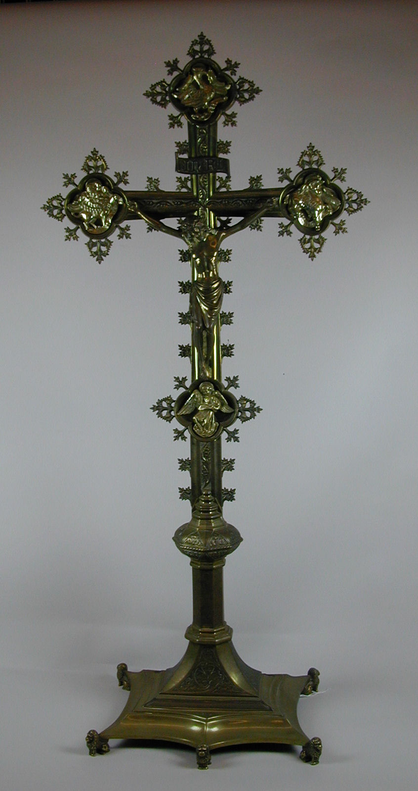 Kruisbeeld op langwerpig voetstuk op zes leeuwtjes met stam met achtkantige nodus