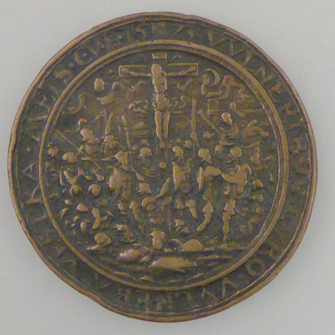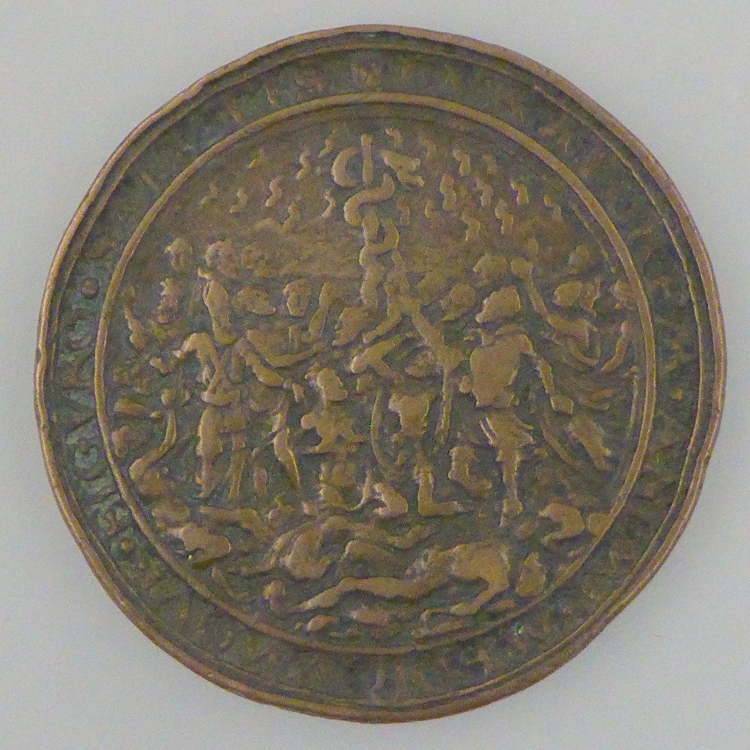 Penning met kruisiging "Vulneribus curo...1573", kz. menigte rond koperen slang in woestijn