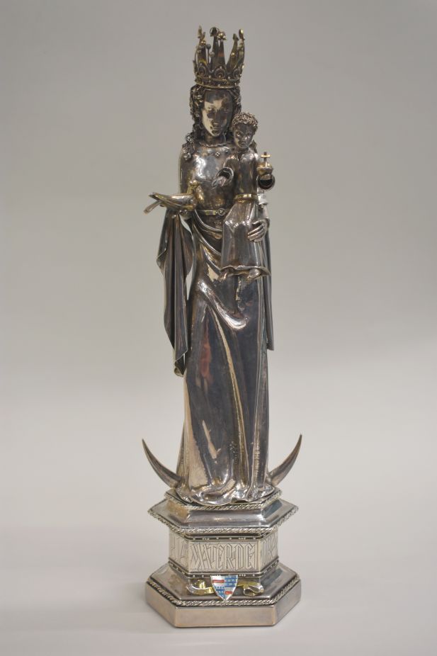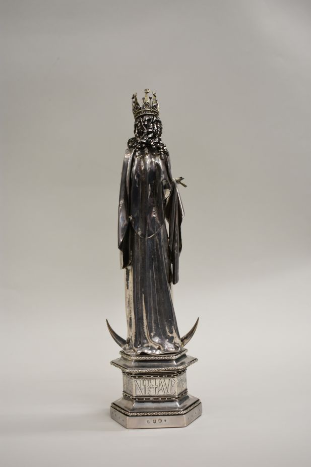 Maria als hemelkoningin met Christuskind, staande op de maansikkel, op sokkel wapenschild en lint met "Breukelen". Op onderste sokkelrand de tekst "BROM 1946". Op middelste sokkelrand de tekst "+ AVE MARIA MATER DEI ORA PRO NOBIS".