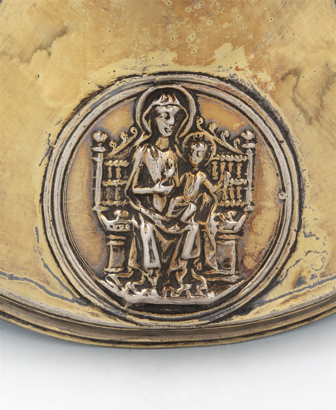 Ronde voet met vier medaillons met voorstellingen Maria, Annunciatie, Kruisiging en Opstanding. Met edelstenen op de voet (2 ontbreken).