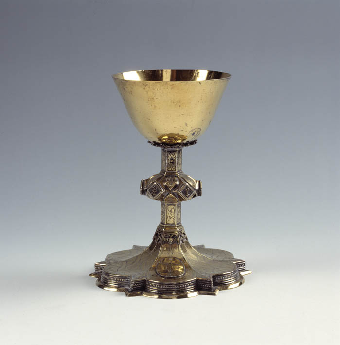 Kelk op zeslobbige voet met twee medaillons met kruisiging en Maria, uit de kerk te Kortenhoef