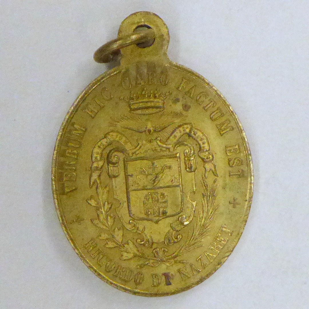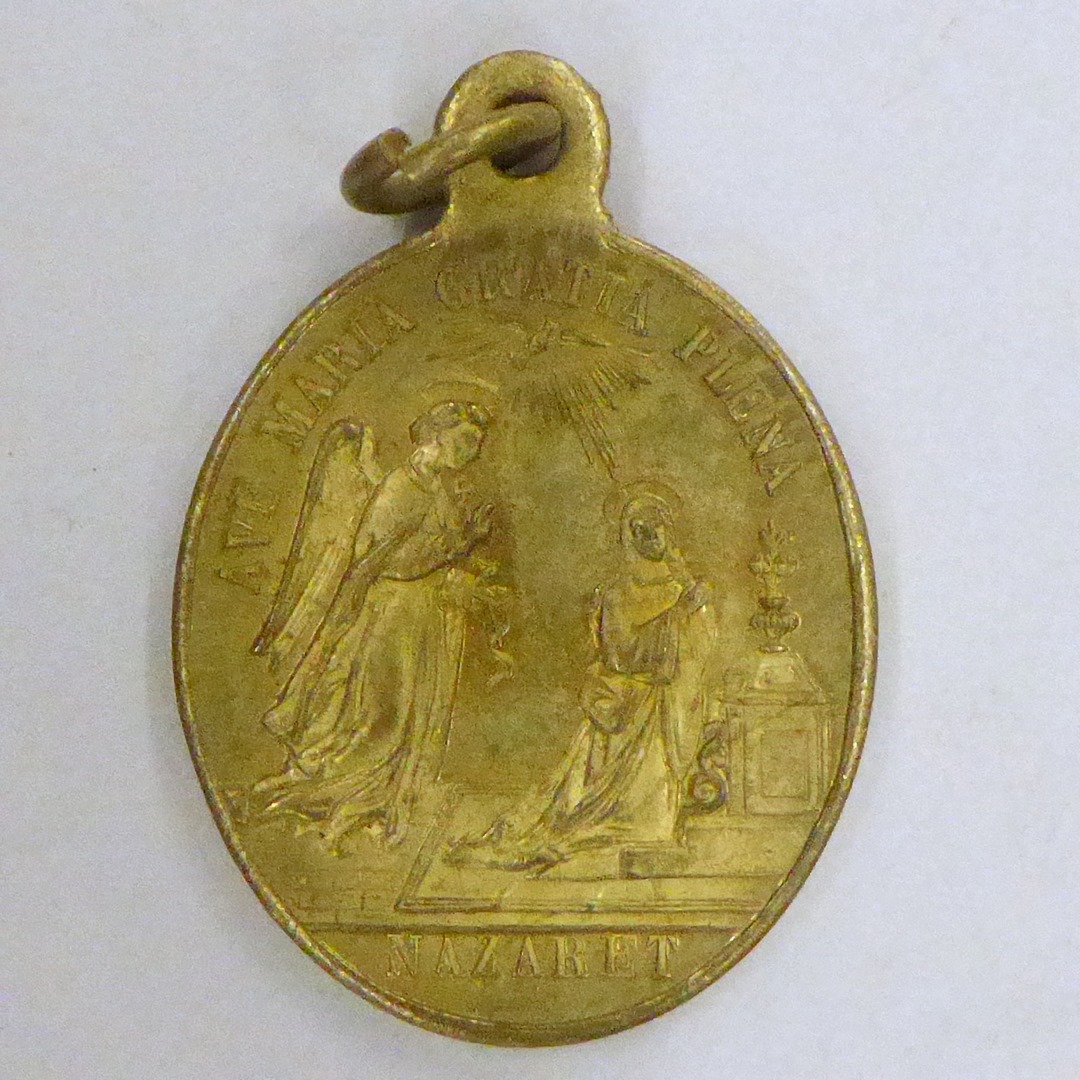 Scapulierpenning, ovaal, met annunciatie met "Ave Maria gratia plena Nazaret", kz. tekst, regalia