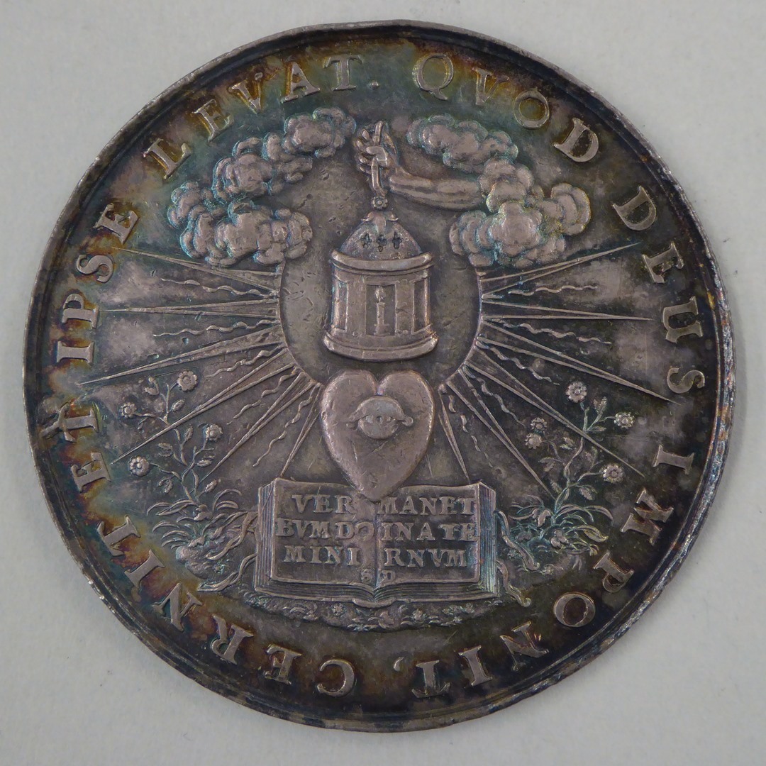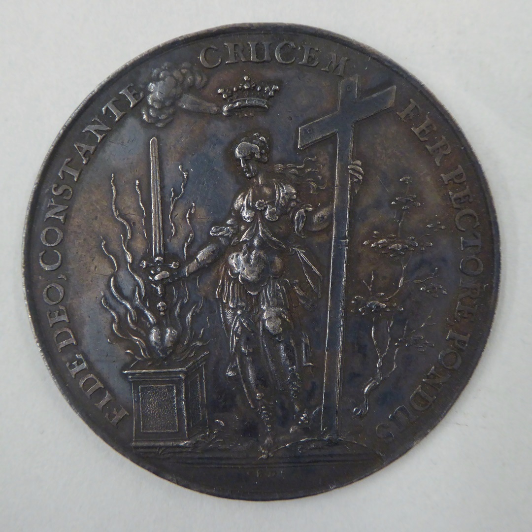 Devotiepenning met "Fide deo constante crucem ferpectore pondus", kz. "Quod deus im ponit ..."