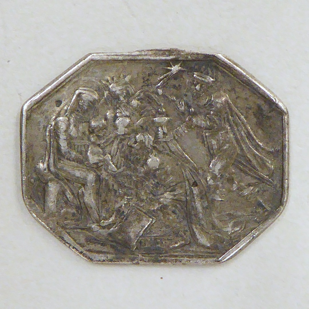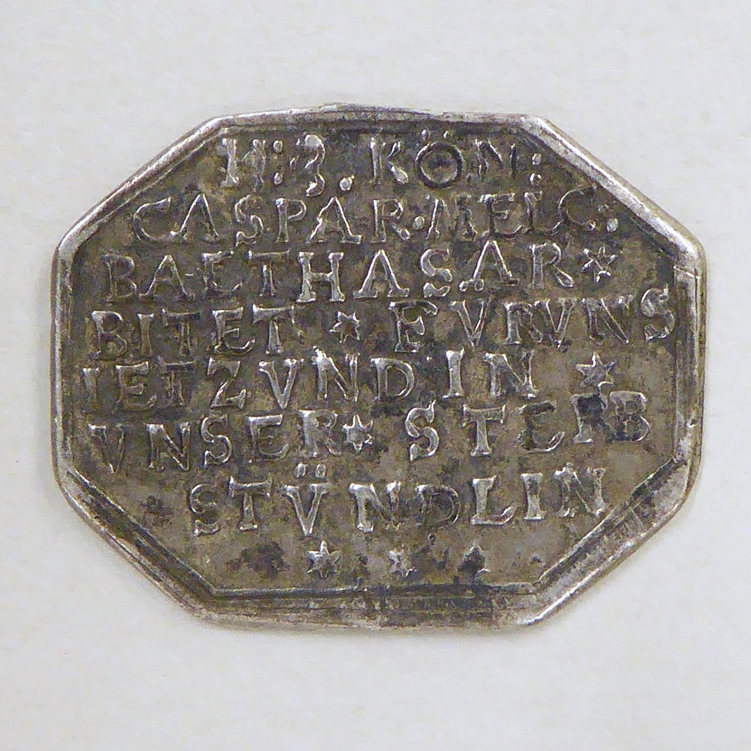 Devotiepenning, achthoekig, met aanbidding der koningen, kz. met "14:3 Kön: Caspar ..."