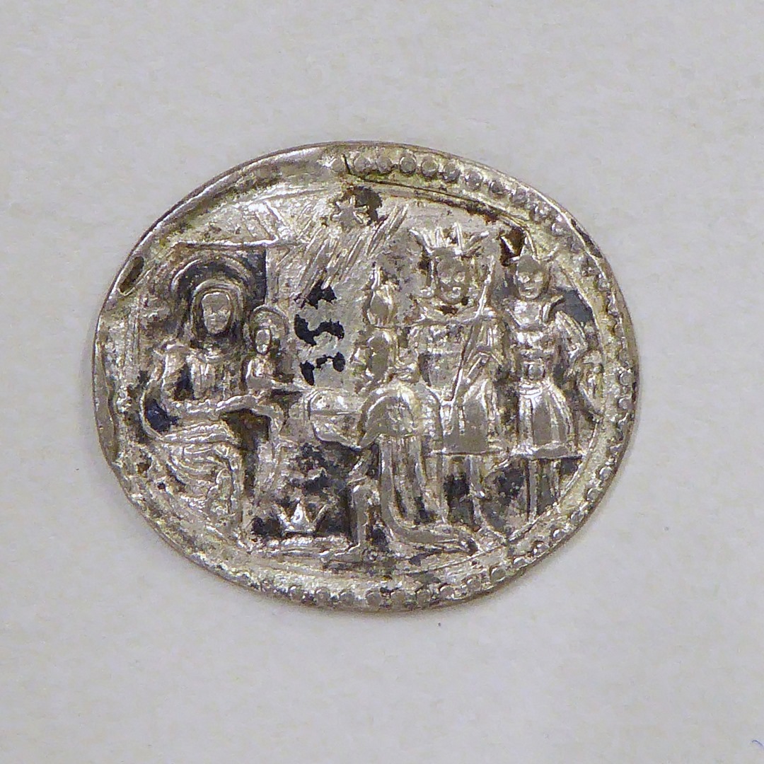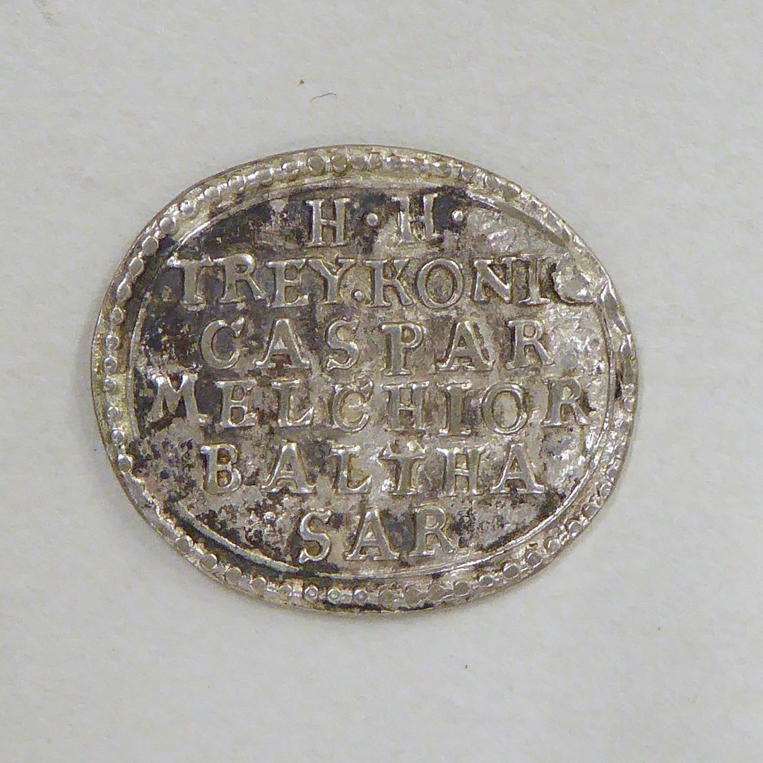 Devotiepenning, ovaal, met aanbidding der koningen, kz. met "H.H. Trey Konig Capsar ..."