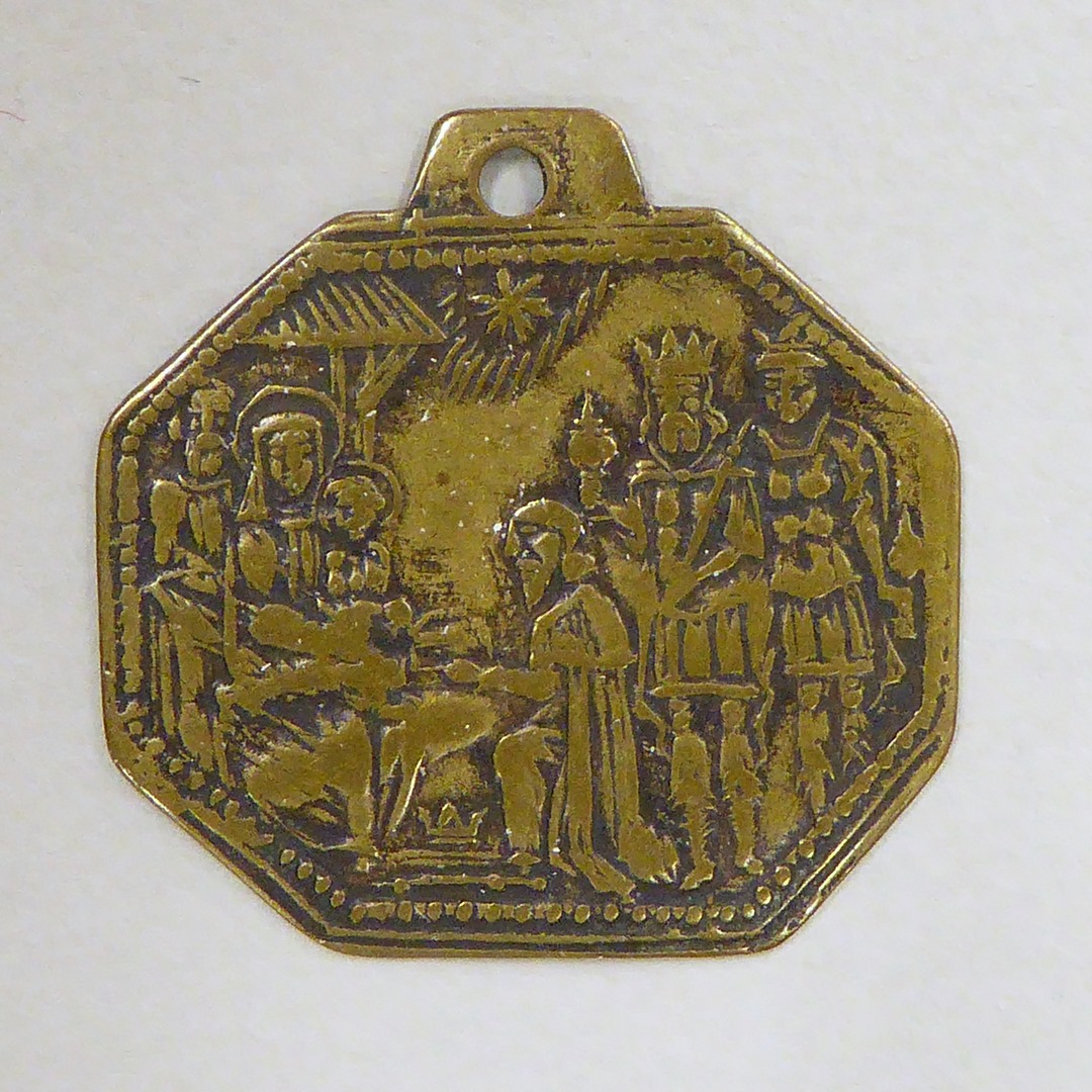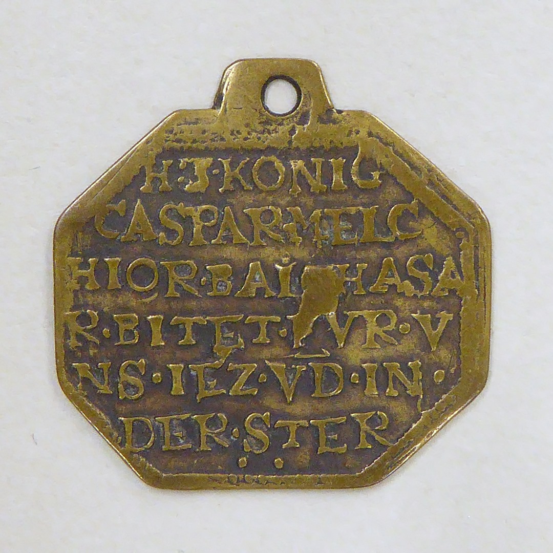 Devotiepenning, achthoekig, met aanbidding der koningen, kz. met "H. 3. Konig Caspar ... der ster"