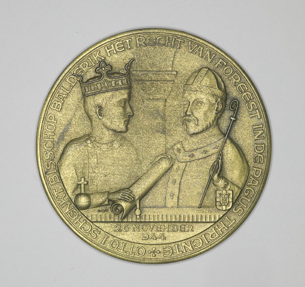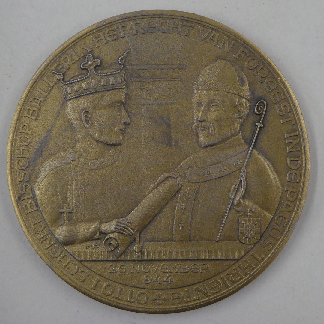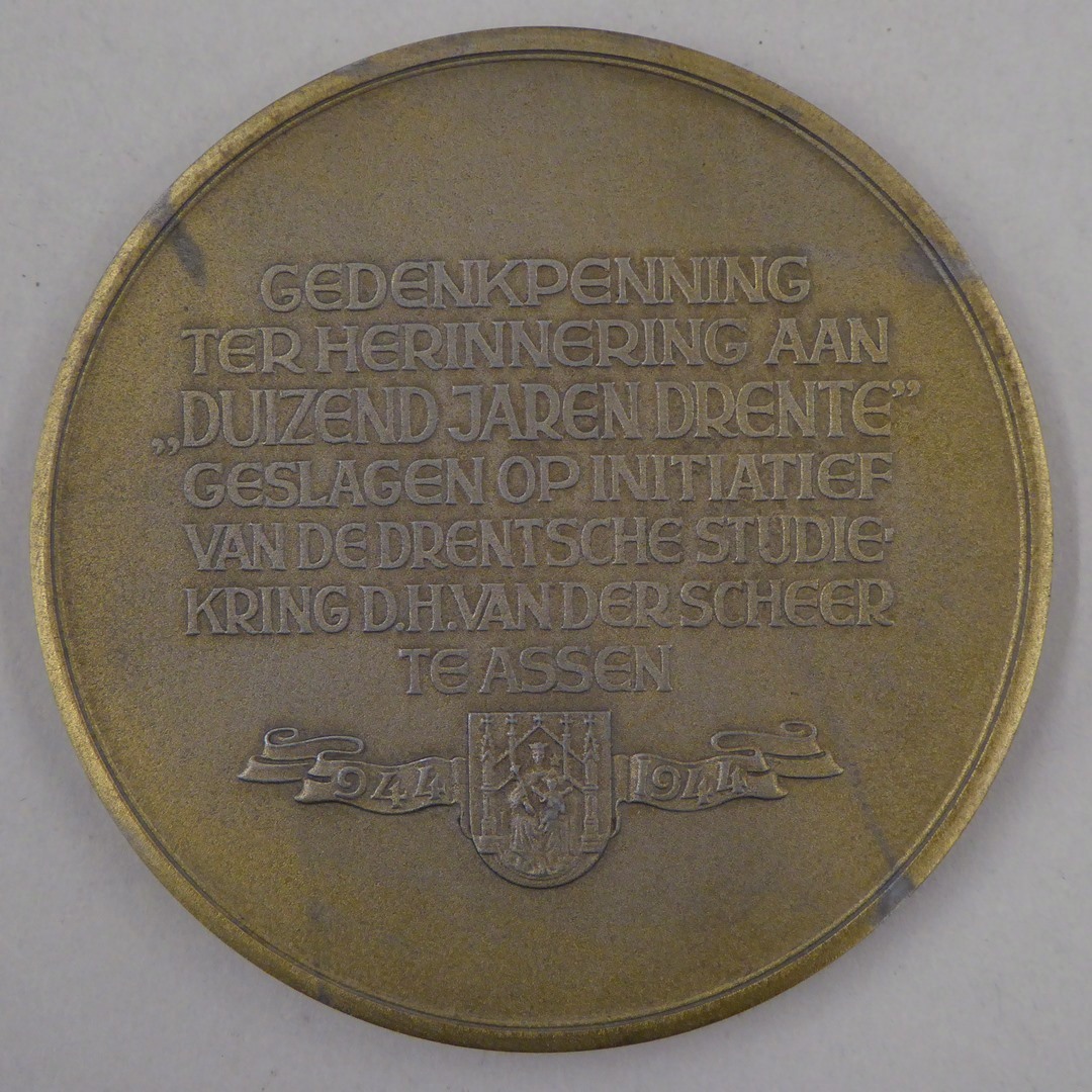 Gedenkpenning t.g.v. duizend jaren Drenthe met schenking Otto I aan bisschop Balderik, kz. tekst