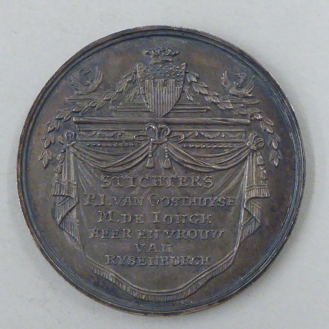 Gedenkpenning met vrouw t.g.v. inwijding kerk St. Petrus' Banden, Driebergen-Rijsenburg op 1 aug 1810, gesticht door P.J. van Oosthuyse en M. de Jongh, heer en vrouw van Rijsenburgh, kz. wapenschild met tekst