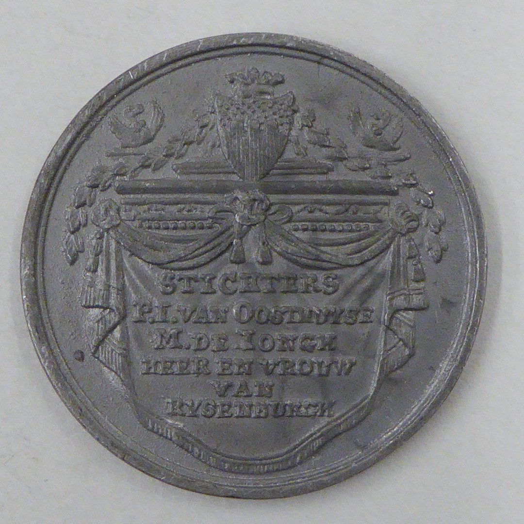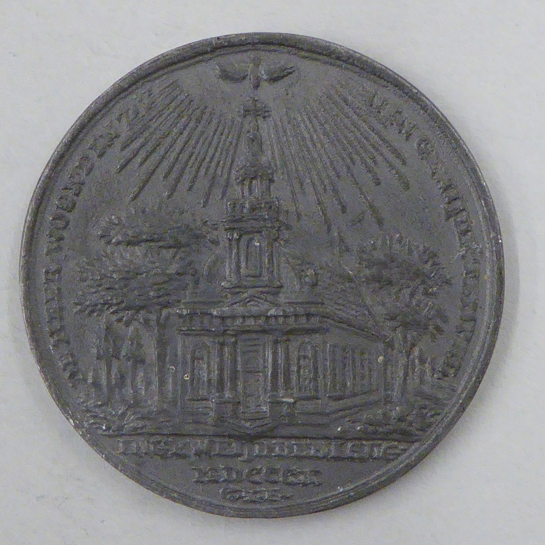 Gedenkpenning met kerk t.g.v. inwijding kerk St. Petrus' Banden, Driebergen-Rijsenburg op 1 aug 1810, gesticht door P.J. van Oosthuyse en M. de Jongh, heer en vrouw van Rijsenburgh, kz. wapenschild met tekst
