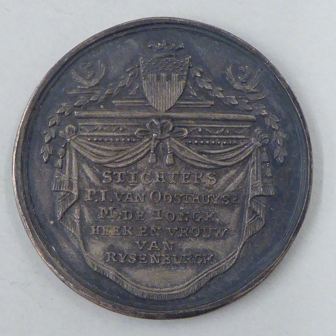 Gedenkpenning met kerk t.g.v. inwijding kerk St. Petrus' Banden, Driebergen-Rijsenburg op 1 aug 1810, gesticht door P.J. van Oosthuyse en M. de Jongh, heer en vrouw van Rijsenburgh, kz. wapenschild met tekst