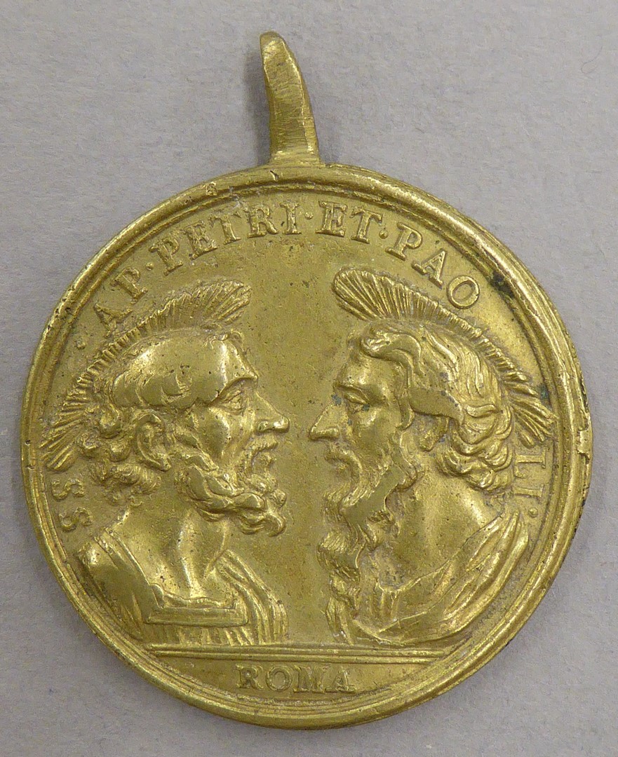 Draagpenning met openen H. Deur, kz. portretten Petrus en Paulus