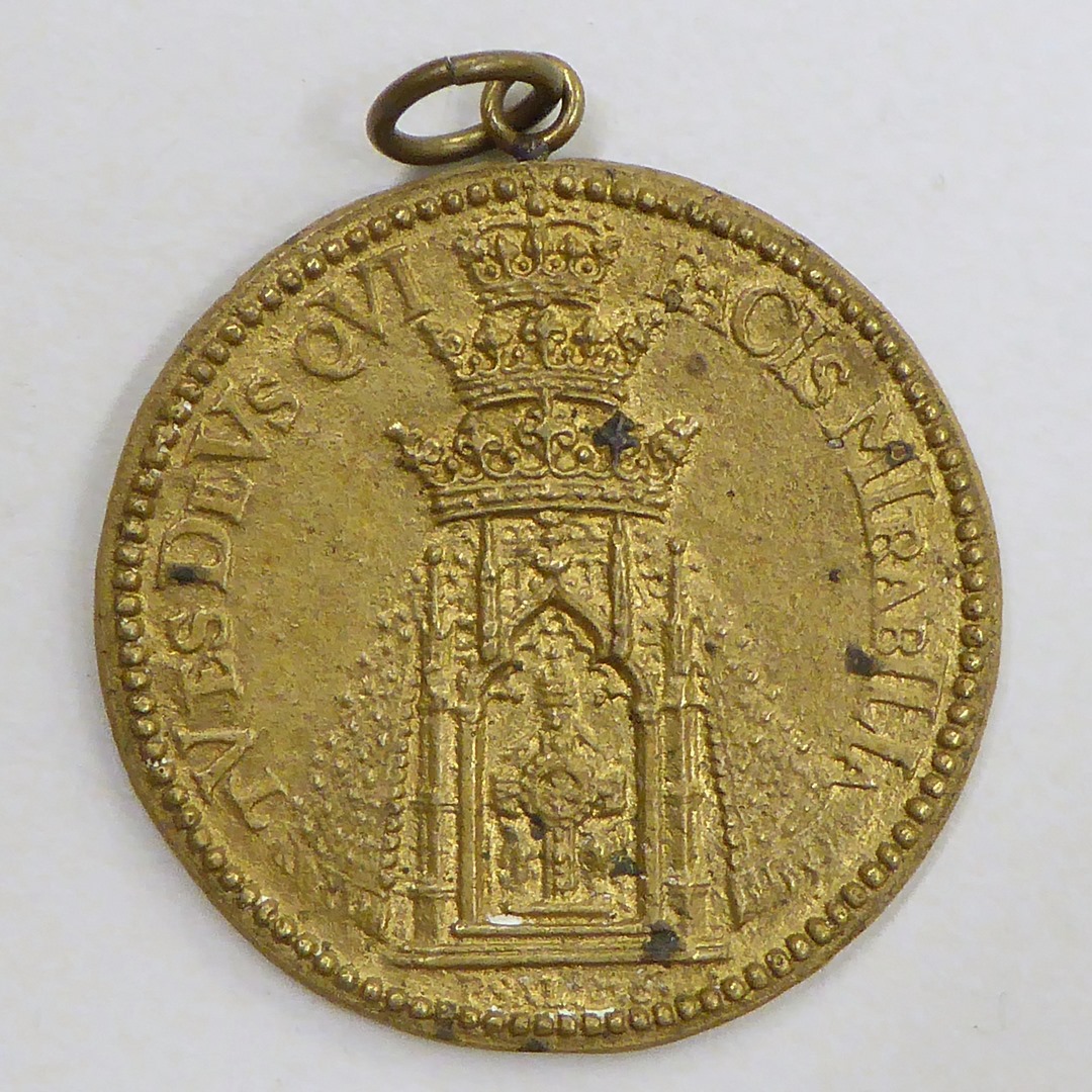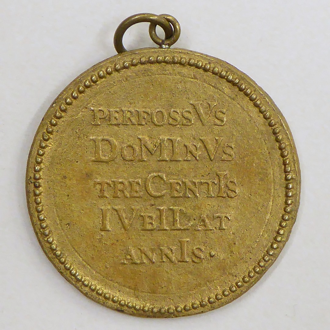 Erepenning met "TV es DeVs qVI faCIs MIrabILIa", kz. met "PerfossVs DoMInVS treCentIs IVbILat annIs"