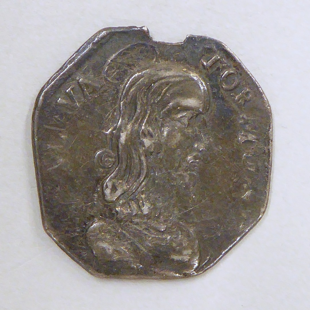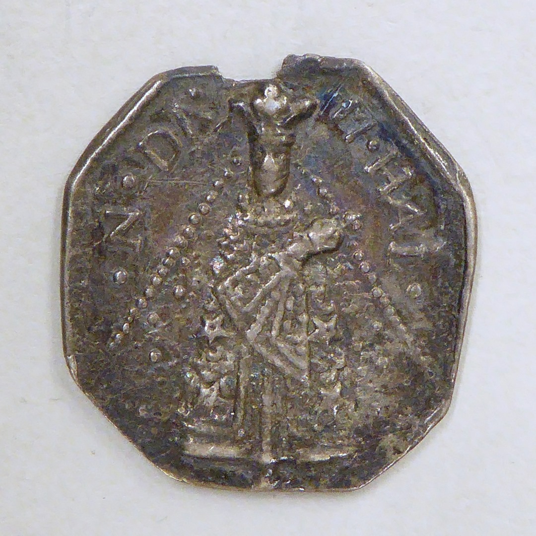 Devotiepenning, achtkantig, met Christus Salvator Mundi, kz. O.L.V. van Hal
